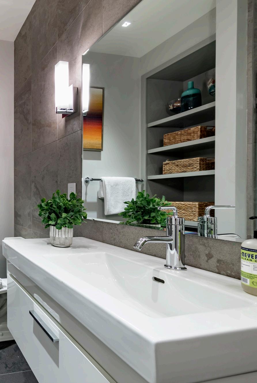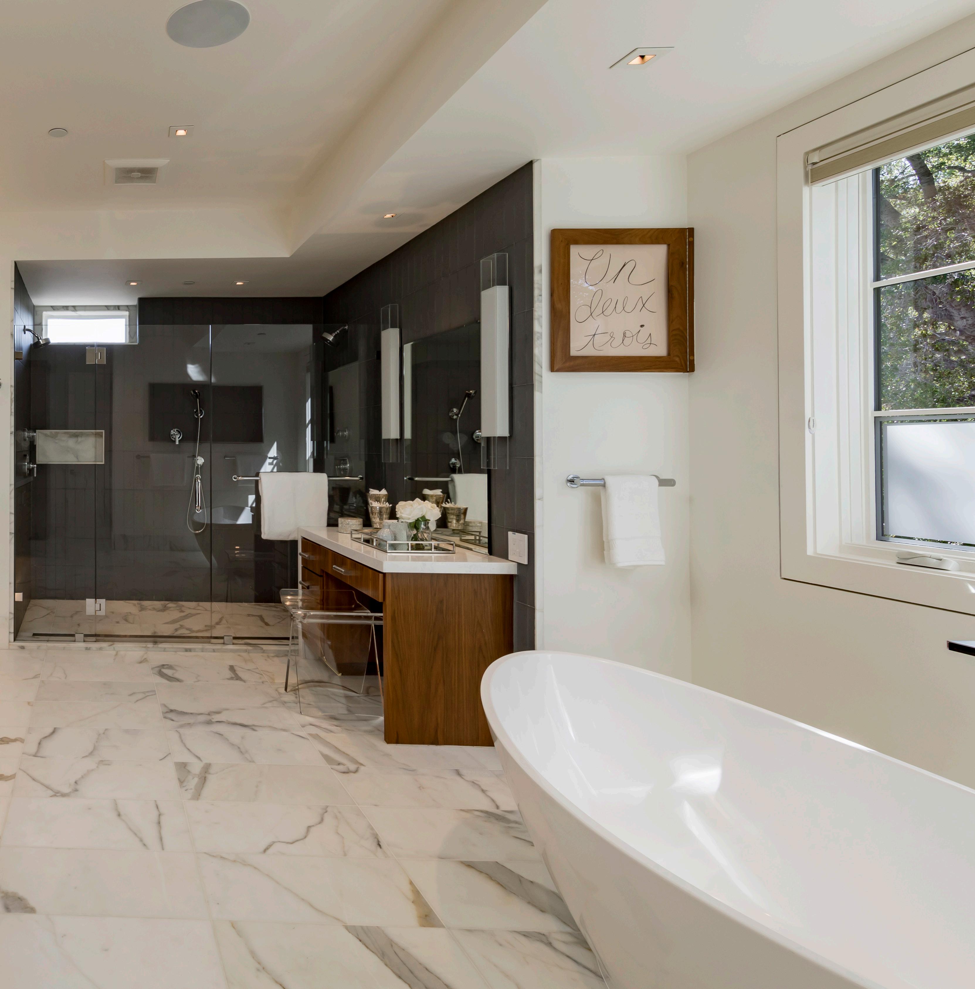 • Upstairs, the primary suite enjoys a massive walk-in closet, a private balcony, and a spa-like bathroom with heated floors, a soaking tub, and shower for two