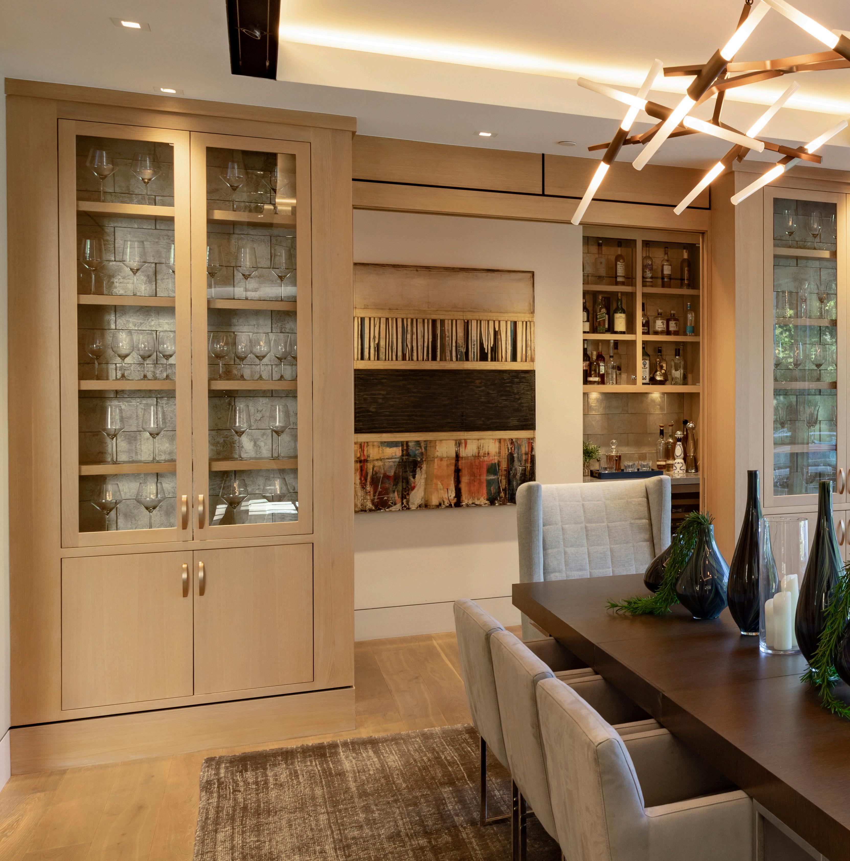 The dining room includes built-in cabinetry and a nearby wet bar area