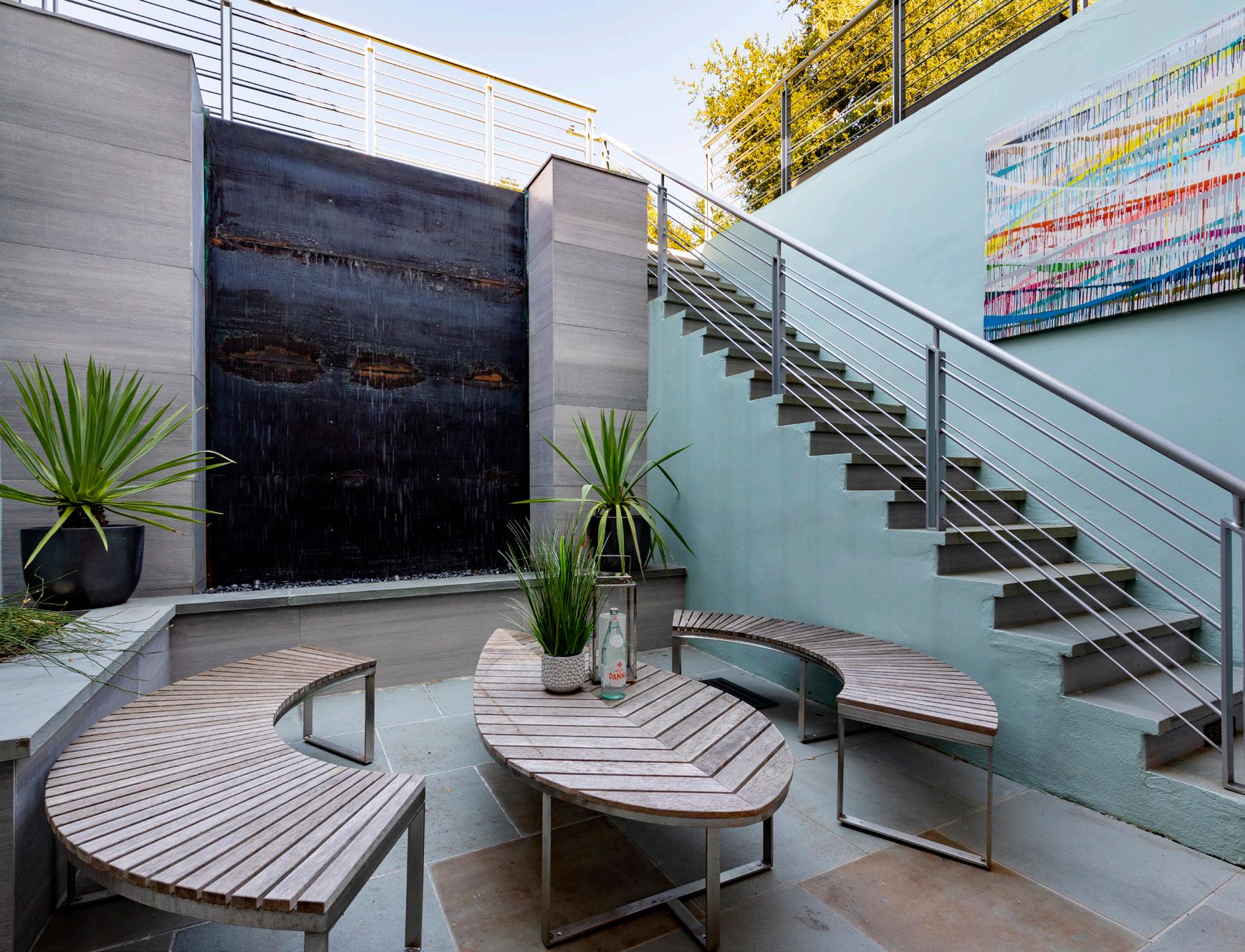 The downstairs level opens to a patio with a delightful waterfall