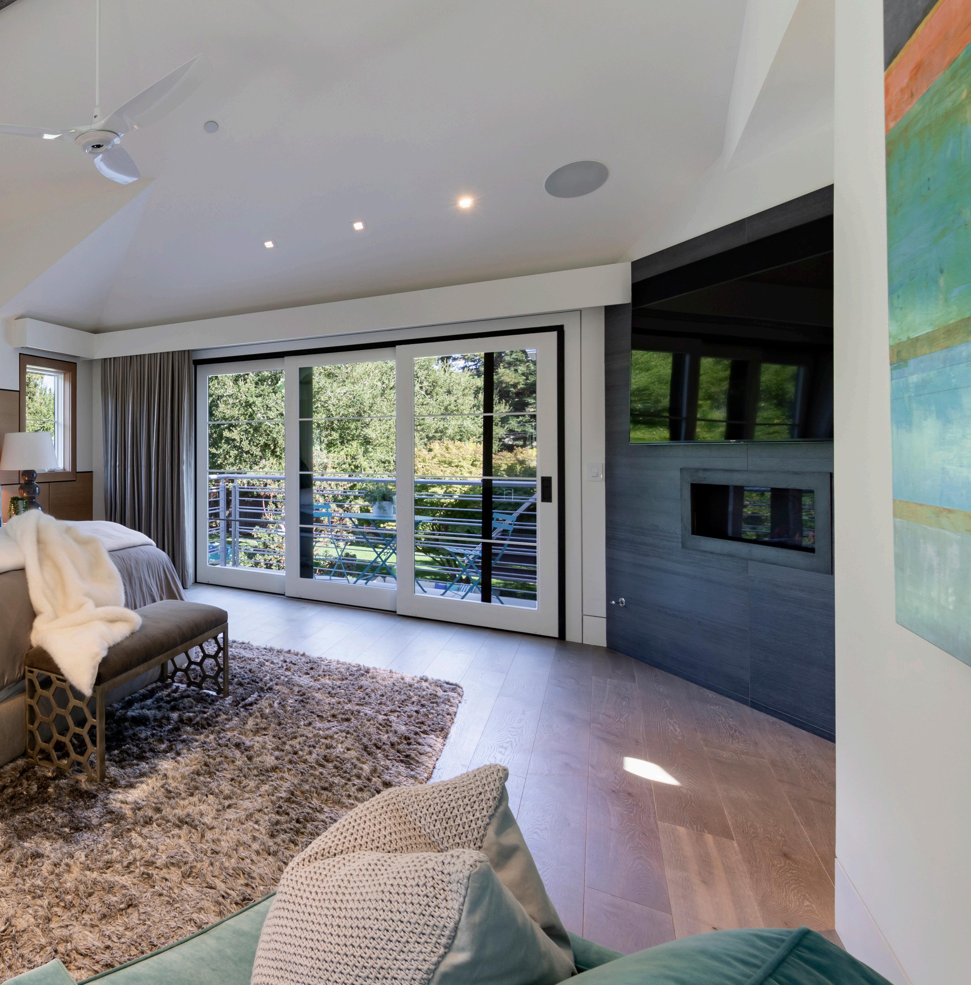 • On the main level, attached guest quarters includes a kitchenette with a Bosch oven, a bedroom, bathroom, and a glass door to a private patio