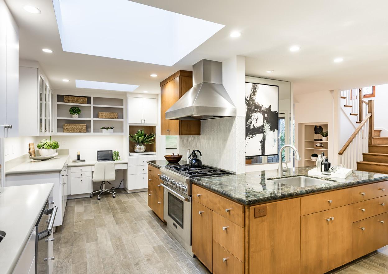 • Chef’s kitchen with granite countertops, soft-close drawers, 2 sinks, and built-in desk area