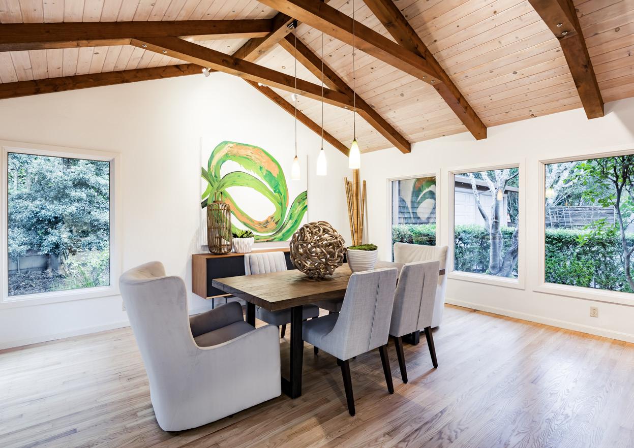 • Beamed, cathedral ceiling crowns dining room with sliding glass door to the outdoors