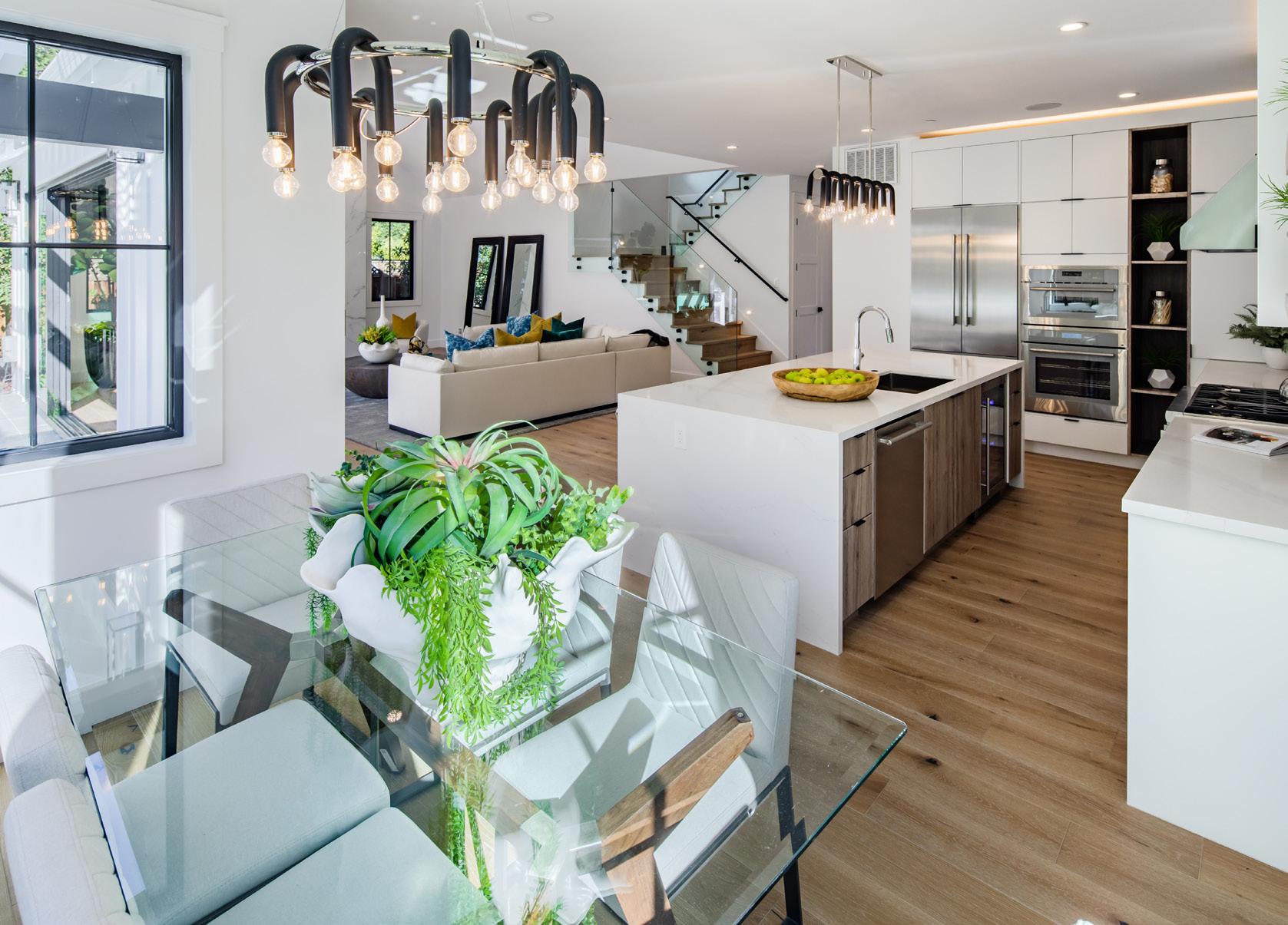 • The living room flows into the dining room, which adjoins the chef’s kitchen featuring sleek cabinetry and a suite of stainless-steel Thermador appliances