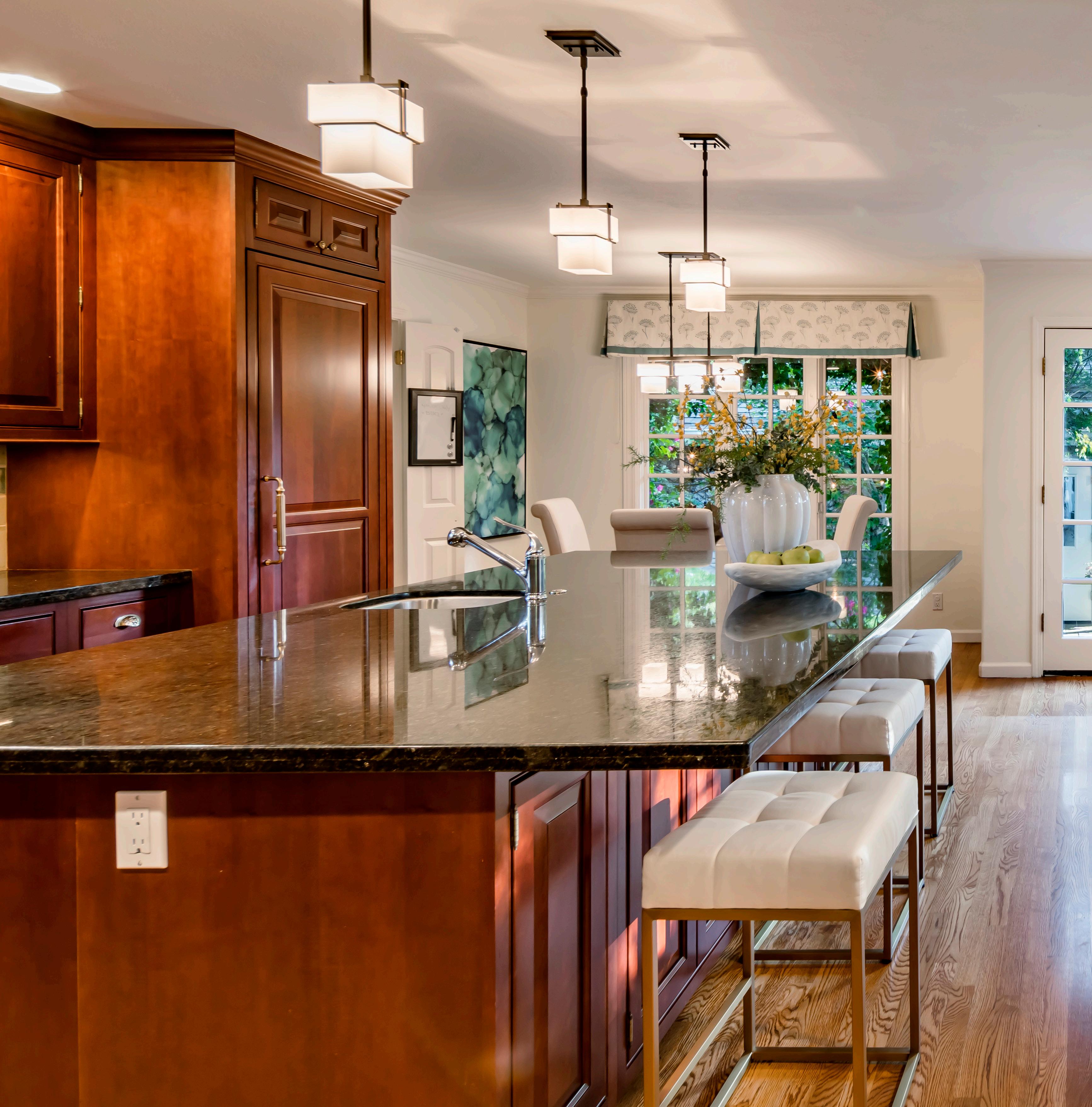 • An oversized island with ample under storage centers the eat-in chef’s kitchen, which features stunning Brazilian Uba Tuba granite countertops, richly hued cherry cabinetry, and a suite of Thermador appliances