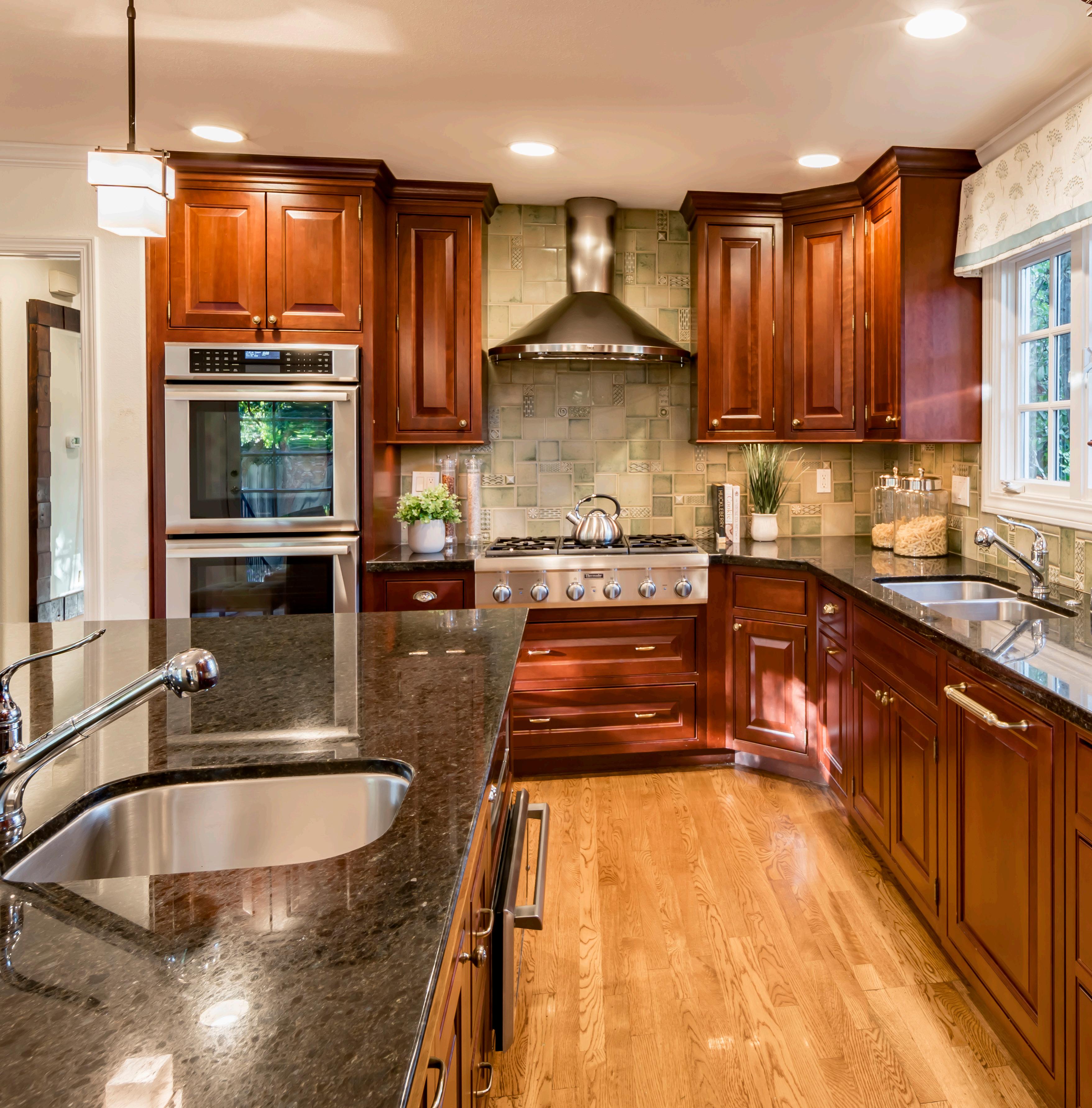The kitchen features stunning Brazilian Uba Tuba granite countertops, richly hued cherry cabinetry, and a suite of Thermador appliances