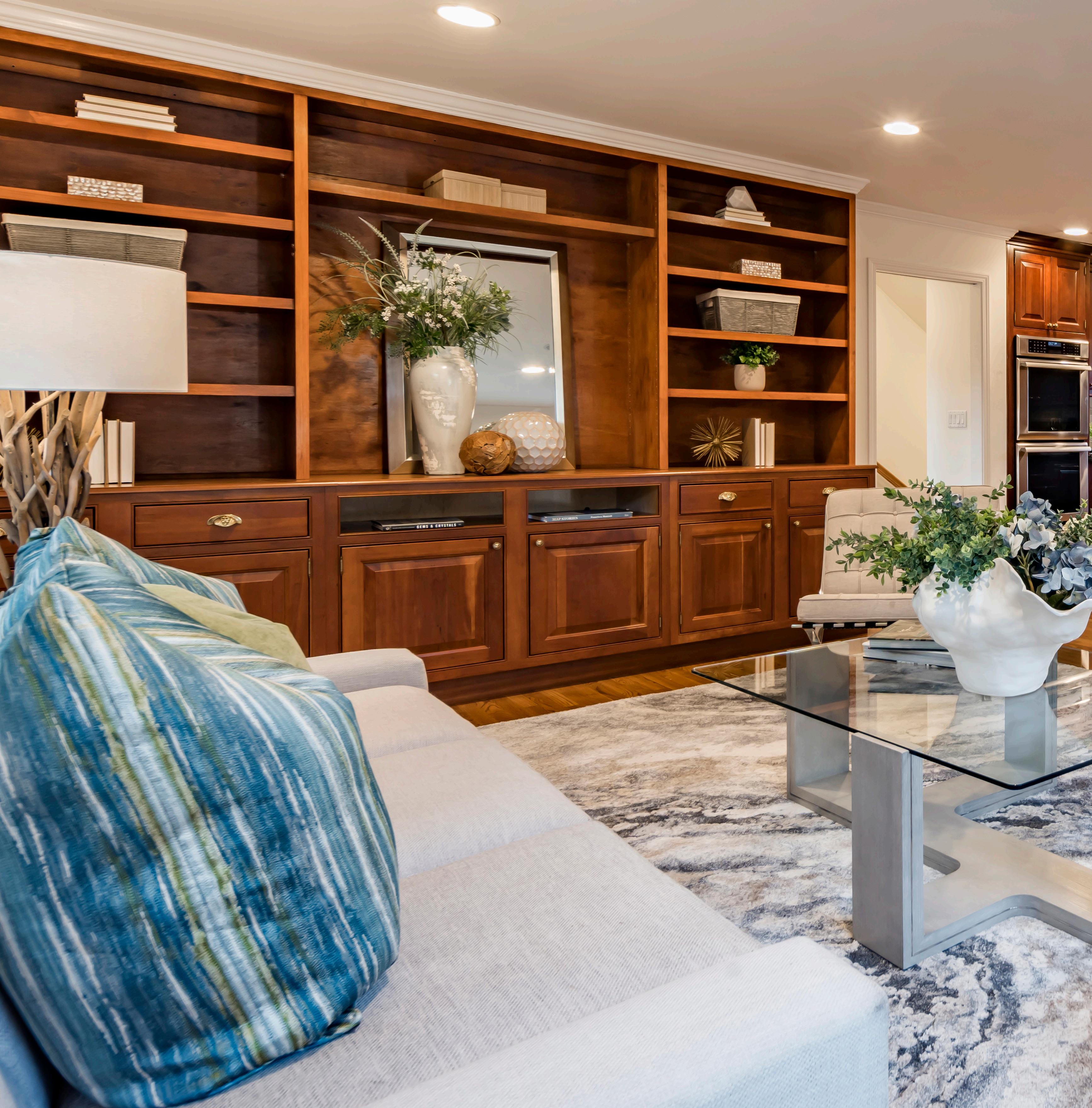 • The kitchen flows into the family room with a built-in entertainment center and outdoor access