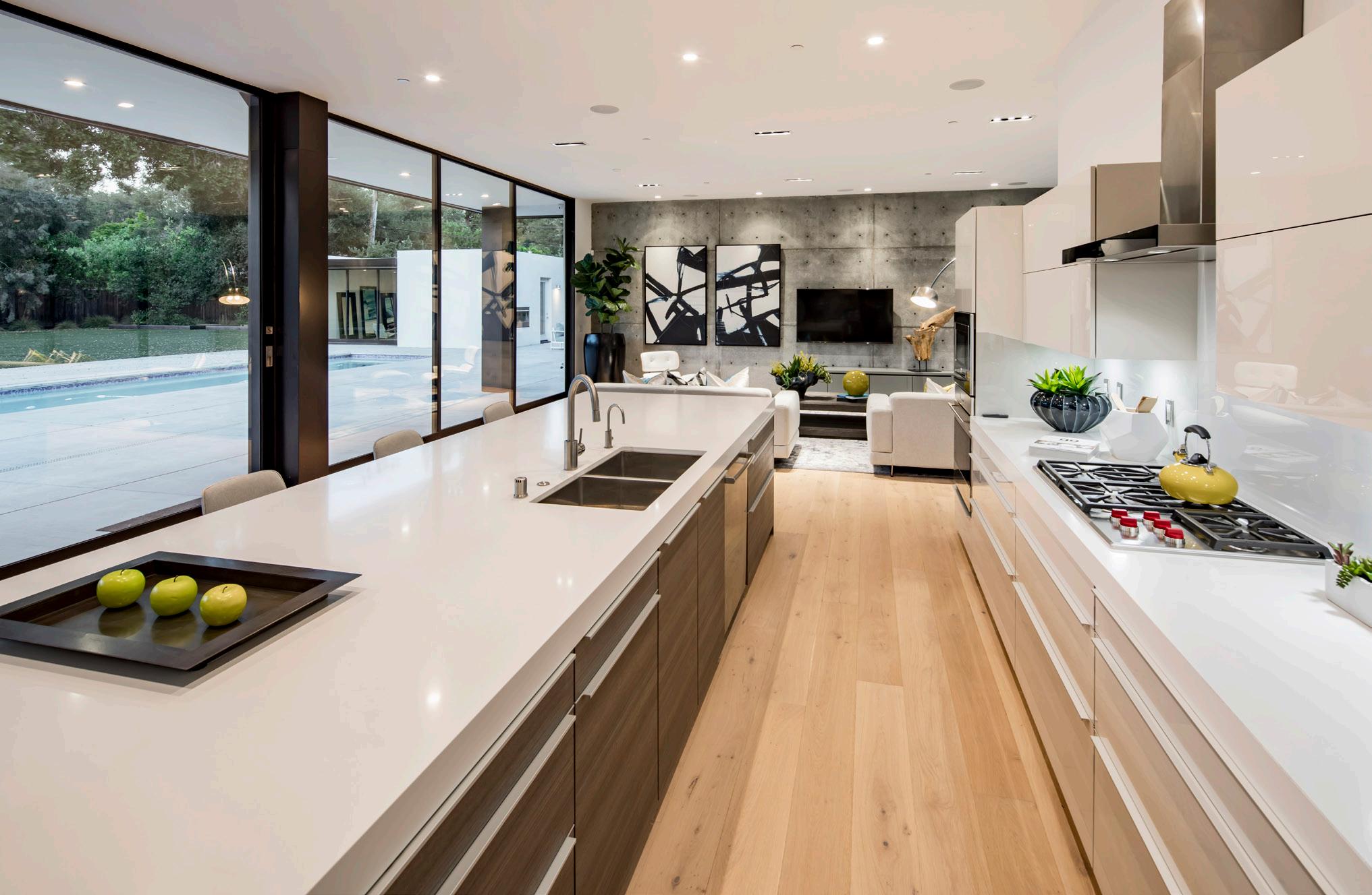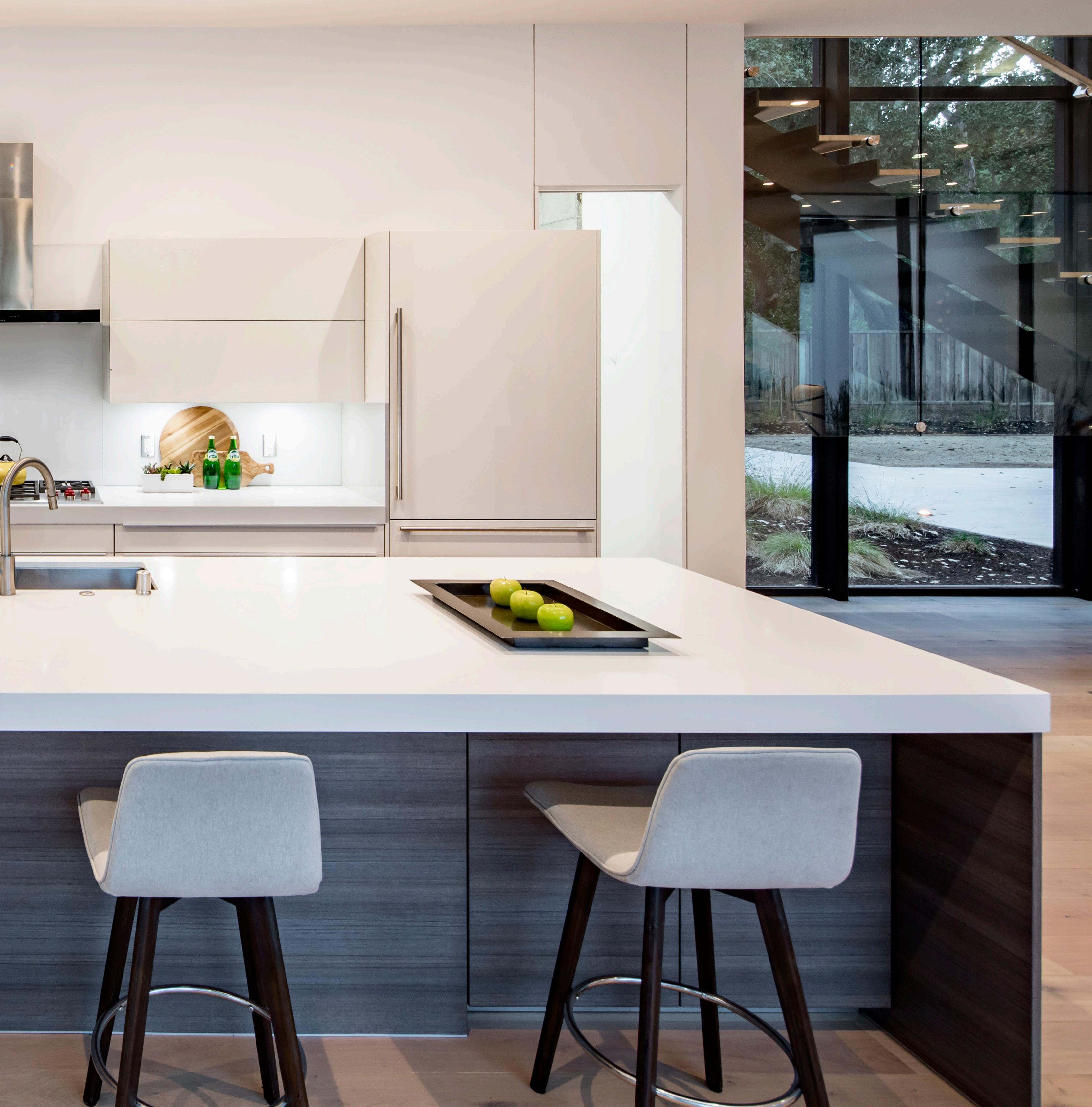 • The chef’s kitchen includes an oversized island, sleek cabinetry, a walk-in pantry, and appliances from Wolf, Bosch, and Sub-Zero