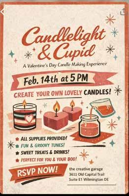 Cuándo: Sábado 14 de febrero. Dónde: The Creative Garage, 3611 Old Capital Trail, Suite E1, Wilmington, DE. Hora: 5:00 PM. Edad: Adultos. Información / Registro: Entradas disponibles en posh.vip/e/candlelight-cupid Celebra San Valentín de una manera especial aprendiendo a crear tus propias velas perfumadas en un taller interactivo lleno de buena música, dulces y bebidas. Todos los materiales necesarios están incluidos, y la experiencia está pensada para que tú y tu acompañante pasen un momento creativo y divertido juntos.