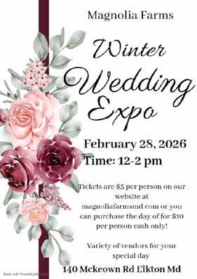 Cuándo: Sábado 28 de febrero. Dónde: Magnolia Farms, 140 McKeown Rd, Elkton, MD 21921. Hora: 12 - 2 PM. Edad: Adultos. Información / Registro: Entradas en magnoliafarmsmd.com o pago en puerta el mismo día (Magnolia Farms Llc) Únete al Winter Wedding Expo en Magnolia Farms, un evento ideal para parejas comprometidas o quienes planean su boda. Podrás conocer una variedad de proveedores que te ayudarán a planear tu día especial, desde catering y fotografía hasta decoraciones y más. Es una excelente oportunidad para inspirarte, hacer preguntas y avanzar en los detalles de tu boda mientras exploras opciones con vendedores locales y expertos en planificación.