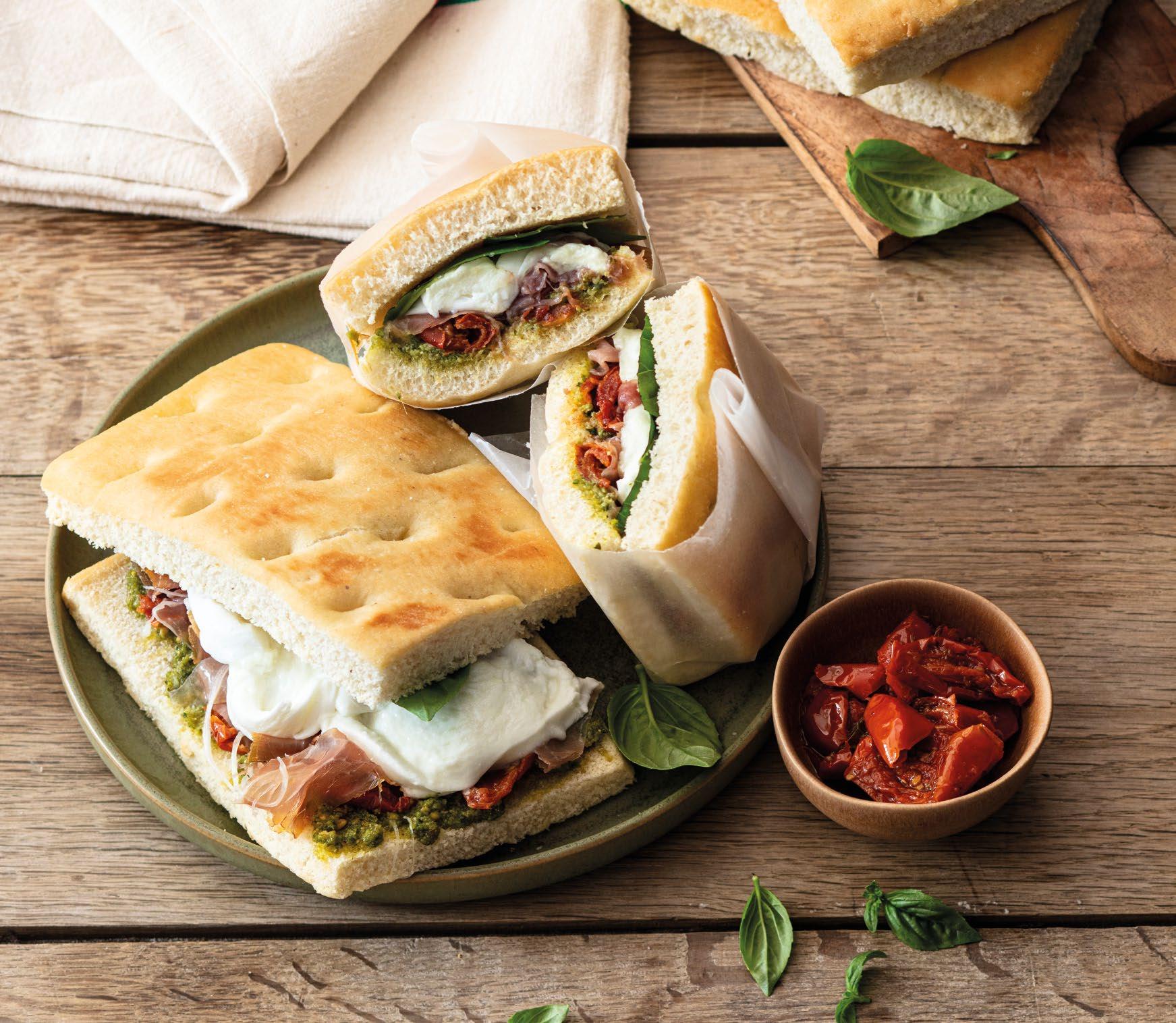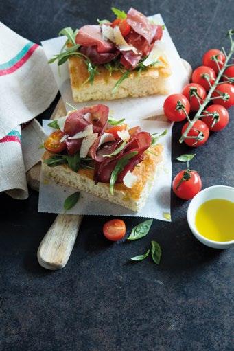 ΑΤΟΜΙΚΗ ΠΡΟ-ΚΟΜΜΕΝΗ FOCACCIA 74128 90 γρ.|36 τμχ/κιβ Μια προ-κομμένη ατομική focaccia, ιδανική για την παρασκευή ψημένων ή κλασικών sandwich PANITALY P 28 Παρασκευάζεται με ζύμη Biga και εξαιρετικά παρθένο ελαιόλαδο για μια τυπική ιταλική γεύση Μεστή, αέρινη ψίχα Προ–κομμένη, έτοιμη να την γεμίσεις ή να προσθέσεις από πάνω φρέσκα υλικά ΠΡΟΕΤΟΙΜΑΣ Ι Α • 5 ΛΕΠΤΆ Ξεπαγώστε τη focaccia και φρυγανίστε απαλά και τις δύο πλευρές. Απλώστε 1 γενναιόδωρο κουταλάκι του γλυκού pesto στην κάτω πλευρά. Προσθέστε δύο φέτες προσούτο Πάρμας. Προσθέστε 2 φέτες τυρί μοτσαρέλα. Προσθέστε 2 φύλλα βασιλικού. Προσθέστε αλάτι και πιπέρι και βάλτε από πάνω την άλλη φέτα focaccia.