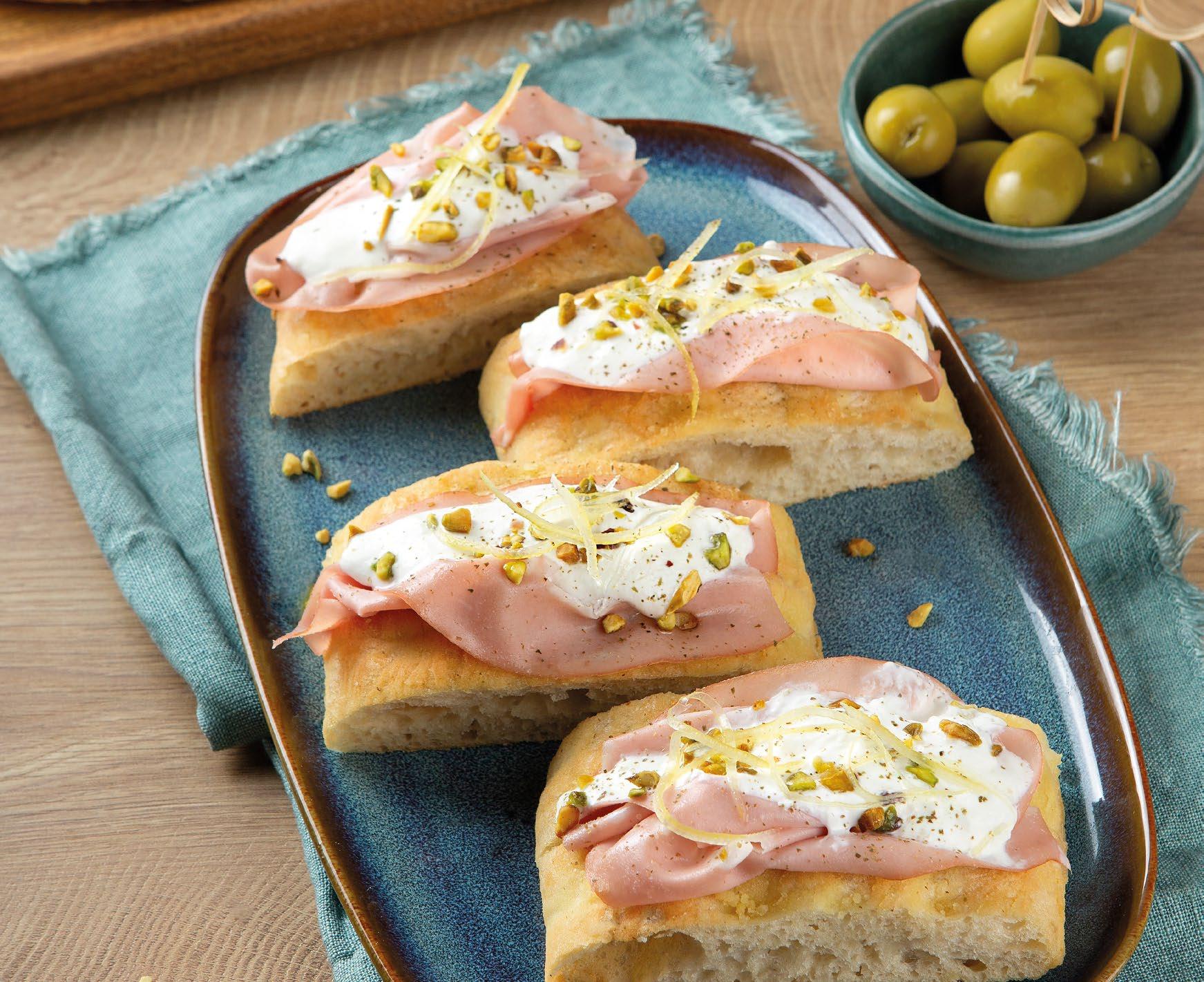 Παράγεται στην Ιταλία με αλεύρι σίτου από διαφορετικές χώρες Πρόταση Σερβιρίσματος 19C84 100 γρ. | 25 τμχ/κιβ Ξαδελφάκι της focaccia Romana, η pinsa παρασκευάζεται από ένα μ είγμα 3 αλεύρων, το οποίο σημαίνει ότι περιέχει λιγότερη γλουτένη 3΄- 4΄ 220°C Αυτή η συνταγή είναι ένα αρμονικό μείγμα από την τραγανή μας pinsa, την πλούσια γεύση της μορταδέλας, την κρεμώδη υφή της burrata και την τραγανή γεύση των φιστικιών. Μπορείτε να φτιάξετε αυτό το σάντουιτς σε μόλις 10 λεπτά, καθιστώντας το ιδανική επιλογή για όσους αναζητούν ευκολία και ταχύτητα στο ίδιο πιάτο. Είτε είστε ιδιοκτήτης αναψυκτηρίου, είτε ενός all day café, αυτή η συνταγή είναι βέβαιο ότι θα εντυπωσιάσει. DRESSING • 5 ΛΕΠΤΆ ΜΕΡΙΚΩΣ ΨΗΜΕΝΗ Συνταγή