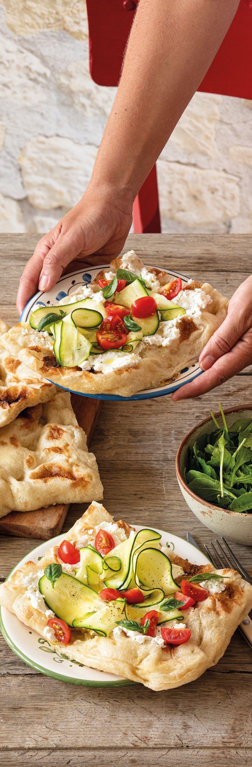 Romana Τυρί Ricotta 120 γρ. Μαριναρισμένα κολοκυθάκια 100 γρ.: Κολοκυθάκια 200 γρ. Λεμόνι 40 γρ. Ελαιόλαδο 60 γρ. Δυόσμος 20 γρ Αλάτι 3 γρ. Μαύρο πιπέρι 2 γρ. Ντοματίνια 8 τεμάχια Ελαιόλαδο Αλάτι & πιπέρι ΠΡΟΕΤΟΙΜΑΣ Ι Α • 5 ΛΕΠΤΆ Ψήστε τη focaccia Romana στους 190°C για 4’ - 5’ Για τα μαριναρισμένα κολοκυθάκια: Χρησιμοποιώντας ένα μαντολίνο, κόψτε τα κολοκυθάκια σε φέτες πάχους περίπου 4 εκ. Ετοιμάστε ένα μείγμα με λάδι, λεμόνι, αλάτι και πιπέρι. Στη συνέχεια, τοποθετήστε τα κομμένα κολοκυθάκια σε ένα δοχείο και προσθέστε το μείγμα του ελαιόλαδου και μερικά φύλλα φρέσκου δυόσμου. Αφήστε τα να μαριναριστούν. DRESSING • 5 ΛΕΠΤΆ Απλώστε 2 κουταλιές της σούπας τυρί ρικότα σε κάθε κομμάτι. Προσθέστε 2 ντοματίνια κομμένα στα τέσσερα σε κάθε κομμάτι και μαριναρισμένα κολοκυθάκια. Προσθέστε μικρά φύλλα βασιλικού, λίγο ελαιόλαδο, αλάτι και πιπέρι.