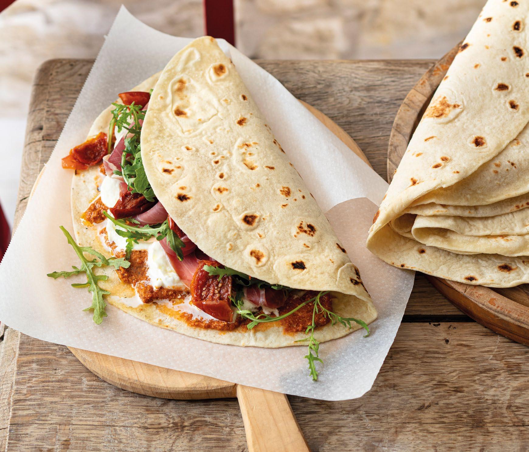 Μια σπεσιαλιτέ της Ρώμης , ιδανικό για wrap Αυστηρά επιλεγμένο αλεύρι σίτου και ζωικό λίπος Ένα λεπτό , επίπεδο ψωμί που είναι εύκολο να τυλιχτεί Το παραδοσιακό sandwich piadina περιέχει προσούτο Πάρμας, ρόκα, και φρέσκο τυρί (squacquerone) PANITALY I P 43 ΣΥΣΤΑΤΙΚ Α ΓΙΑ 1 ΜΕΡ Ι ΔΑ 1 piadina 20 γρ. κόκκινο pesto 15 γρ. ρόκα 20 γρ. προσούτο Πάρμας 30 γρ. βουβαλίσια mozzarella 30 γρ. λιαστές ντομάτες ΠΡΟΕΤΟΙΜΑΣ Ι Α • 5 ΛΕΠΤΆ Ψήστε τη piadina σε αντικολλητικό τηγάνι, για 1 λεπτό ανά πλευρά. Απλώστε 2 κουταλάκια του γλυκού κόκκινο pesto πάνω σε όλη τη piadina. Τοποθετήστε τις φέτες του προσούτο Πάρμας κομμένες σε πολλά κομμάτια και απλώστε τις στο ένα μισό της piadina. Προσθέστε 3 φέτες μοτσαρέλα και μερικές λιαστές ντομάτες. Προσθέστε ρόκα. Προσθέστε αλάτι και πιπέρι και κλείστε το ψωμί.