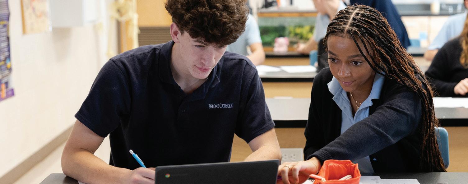 Delone Catholic sustains an academically rigorous and faithcentered curriculum that challenges every student to think critically, act ethically, and pursue excellence in all endeavors. Rooted in our Catholic identity and commitment to educating the whole person, we provide diverse educational and career pathways that prepare students for success in college, the trades, and beyond. Through differentiated instruction, handson learning, and guidance from dedicated, highly qualified educators, we ensure that each learner discovers their Godgiven talents and is equipped to lead, serve, and thrive in their chosen vocation.