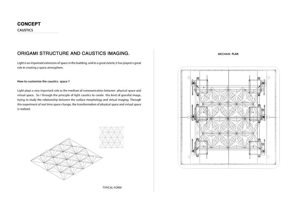 The design explores the question of the boundary between virtual and physical space, considering which substances act as a bridge to this boundary. Is it people, networks, or natural substances. Light plays an important role in the extension of space and the creation of atmosphere. From the point of view of exploring the relationship between light and geometry, the correspondence between graphic space and light space can be well modelled with the help of the principle of focal dispersion of light and the properties of plastic materials. The angle of rotation of the servomotor is controlled by the TouchOSC interactive software, which enables a customised change in the graphic space of the origami (i.e. a constant change in the position of the folds on the surface) in real time.
