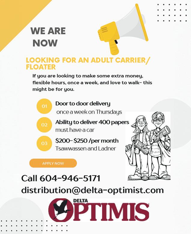 “Without water, farmersand ranchers simply cannotprovidea reliable supplyof agriculturalproducts to British Columbians. Thisfunding will helpalleviate someofthosepressures,” said VanMarrewyk, who’s on the Delta Farmers Institute, andthe B.C. Agriculture Council.