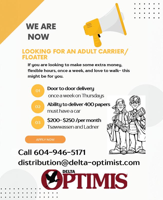Yard Cleanup& PressureWashing We handleJapaneseBeetle Residential &Strata GREENSAVEGARDENING &LANDSCAPING LTD. Lawn Cutting Trimming &Pruning Yard Cleanup& PressureWashing Yard Maintenance We handleJapanese Beetle Commercial &Strata Moving ABE MOVING •DELIVERY andRubbish Removal $45/hr perperson.24/7 604-999-6020 Painting/ WallPaPer D&M PAINTING Exterior/InteriorSpecialist Many YearsExperience. FullyInsured. TopQual ty •Quick Work. Freeestimate. 604-724-3832 MasterBrushes PAINTING EXTERIOR PAINTING EXPERTS 3rms $750, 4thrmhalf price,First 4roomsbaseboards &Windowsills FREE Repairs &2coatsofpaint. Topqualitypaintand workmanship. Satisfaction Guaranteed 778-545-0098 604-396-7707 Calltoadvertisein HomeServices 604-362-0586 May23,2024 TheDeltaOptimistA47