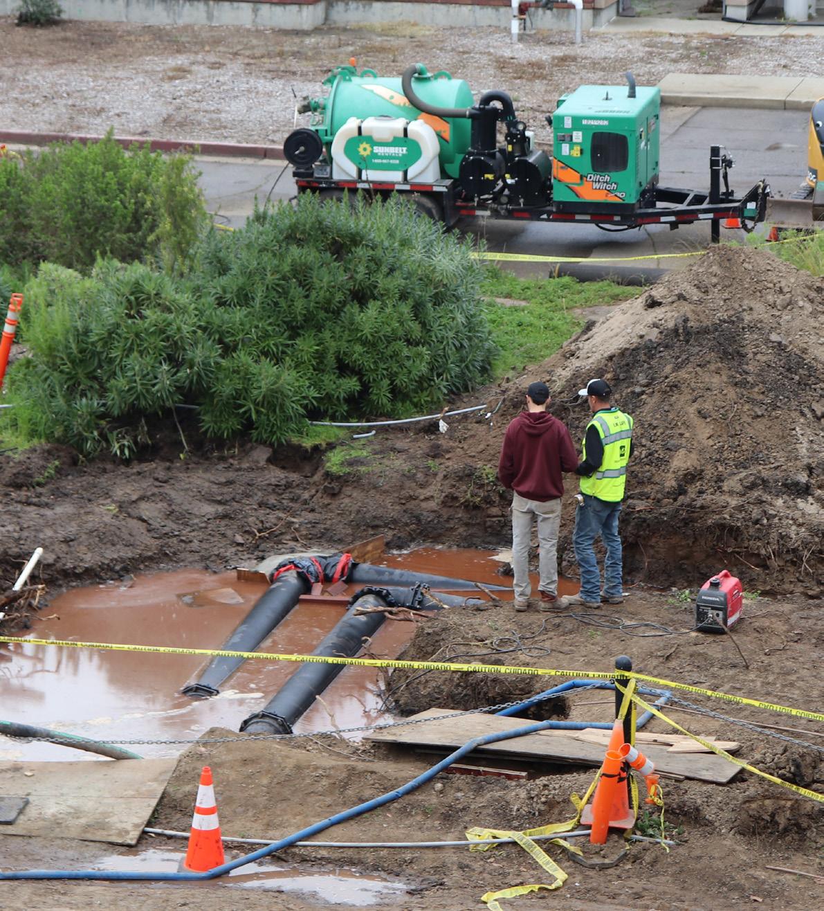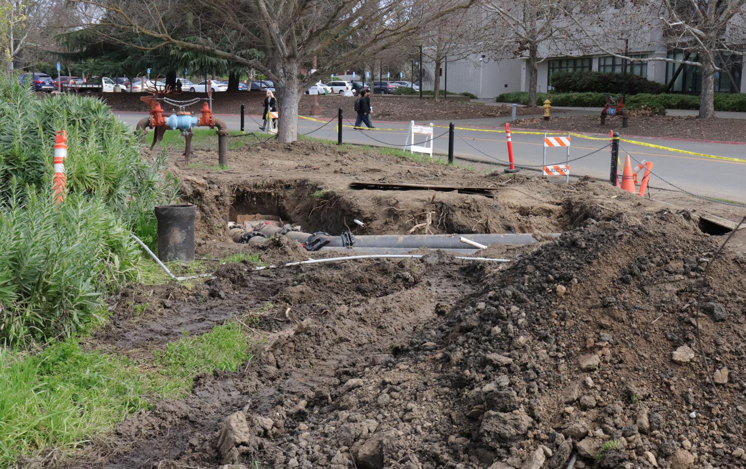 That wasn’t the case on Feb. 24 when campus reopened. Work was still being done on a large section of pipes along North Burke Bradley Drive. At one point Tuesday morning the system was turned back on and water erupted from the pipelines, flooding the hole dug out to reach the failing pipes.