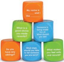 This set of six colorful conversation cubes features engaging prompts that target topics related to social-emotional learning (SEL). One-on-one or in small groups, kids can take turns rolling the cubes and answering one of the 36 questions and prompts printed on the sides. Three colors split the cubes into categories: orange Ice Breaker questions, blue Social Skills prompts, and green Emotional/Feeling prompts. Made from easy-to-clean soft foam. Ages 5+.