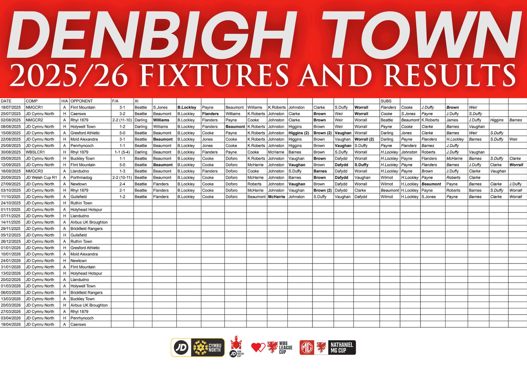 Denbigh Town: A Jones, Williams, Vaughan, Cooke, Lockley, K Roberts, S Jones, Brown, I Roberts, Duffy, Davies