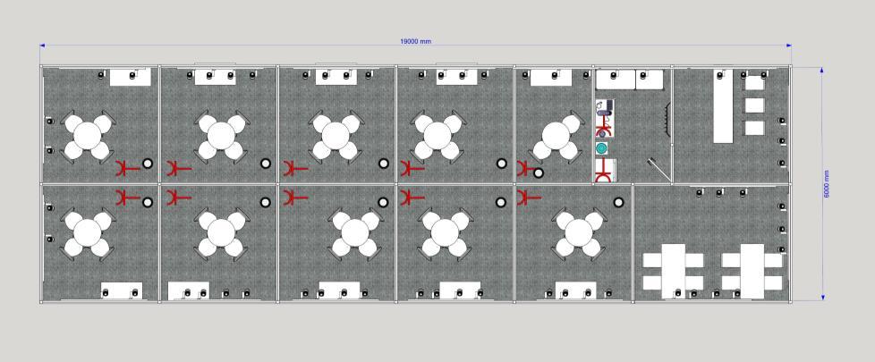 Carpet: coloured grey, directly on floor | Maxima Profile with laminated plywood wall panels | Maxima system structure above stands, approx. 1200mm high | Horizontal fascia board | 300mm high including company lettering and stand number | 1pcs Round table with white top | 4pcs Chair in black | 1pcs lockable counter (1m in height) | 1pcs wastepaper bin | 4pcs spotlights | 1pcs Socket