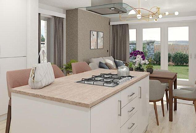 The Kingston house type comprises an airy reception hallway with useful built-in storage and a WC cloakroom. The hall is galleried and fitted with roof windows for a flood of natural light. The living room is set to the rear of the property, with garden access through French doors.