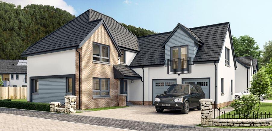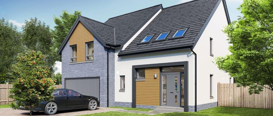 for a breakfasting area and is supplemented by a utility room (with built-in storage and external access), which completes the ground-floor accommodation. A landing (with storage) on the first floor leads to the home’s four double bedrooms and a bathroom. The two largest bedrooms boast built-in wardrobes and their own en-suite shower rooms, while the remaining bedrooms are served by the fourpiece family bathroom. Herriot benefits from an integral single garage (with hall access) and a private driveway.