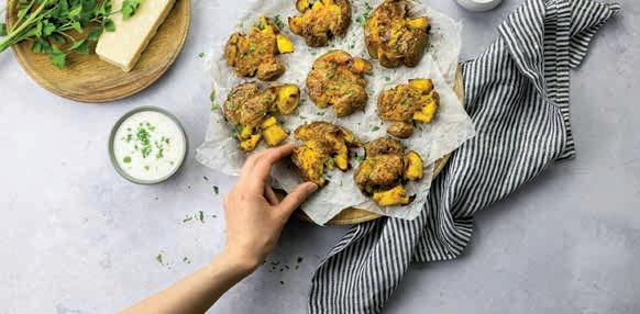 1 denner.ch/rezepte – von Zoe Torinesi Smashed Potatoes mit Parmesan-Zitronen-Dip im Video-Tutorial