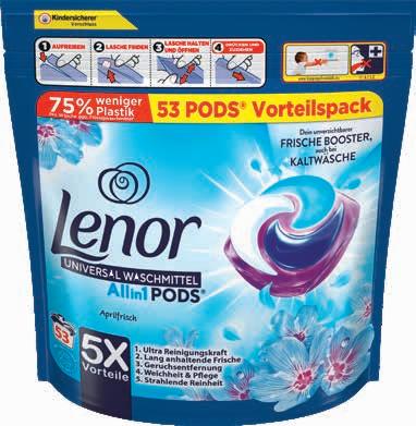 51% GRATIS 22.95 Perwoll Feinwaschmittel Black / Blossom / Wool & Delicates / Color 2 x 50 Waschgänge, 2 x 2,75 Liter 40% 17.95 statt 30.05* Lenor Waschmittel All in 1 Pods Aprilfrisch / Amethyst Blütentraum 53 Stück SPECIAL 14.95 Kleenex Haushaltspapier Ultra-Clean 12 Rollen 32% 6.65 statt 9.90 Chanteclair Universaler Fettlöser extrastark, Marseille-Seifen-Duft, 2 x 750 ml 33% ab 2 Stück ** Felix Leckerlis Party mix Original / Strandspass 200 g 29% 22.95 statt 32.75 Gillette Systemklingen Mach3 Turbo 12 Stück 42% 11.95 statt 20.80*/24.95* Pampers Feuchttücher Fresh Clean / Sensitive 416 Tücher 25% 4.65 statt 6.25 Trisa Travel Set 1 Stück * Konkurrenzvergleich / 19 ** Nicht mit anderen Gutscheinen und Bons kumulierbar Auch auf bestehende Aktionspreise!