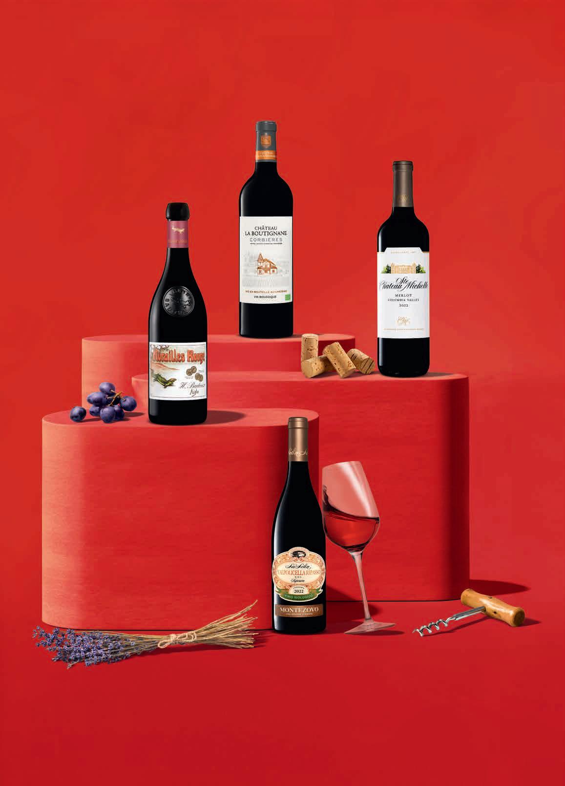1 — Badoux Murailles Rouge AOC Chablais, Suisse, Vaud, 2023, 70 cl 2 — Bio Château La Boutignane Rouge Corbières AOP, France, Languedoc-Roussillon, 2024, 75 cl 3 — Château Ste Michelle Merlot Columbia Valley, États-Unis, Washington State, 2022, 75 cl 4 — Bio Monte Zovo Sa’ Solin Ripasso della Valpolicella DOC Superiore, Italie, Vénétie, 2022, 75 cl