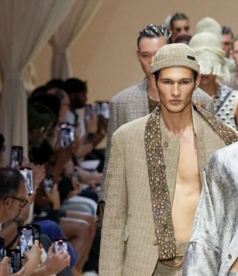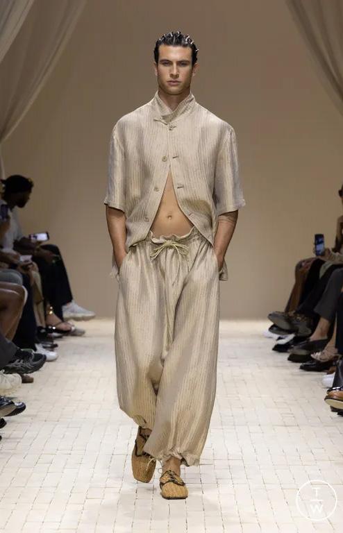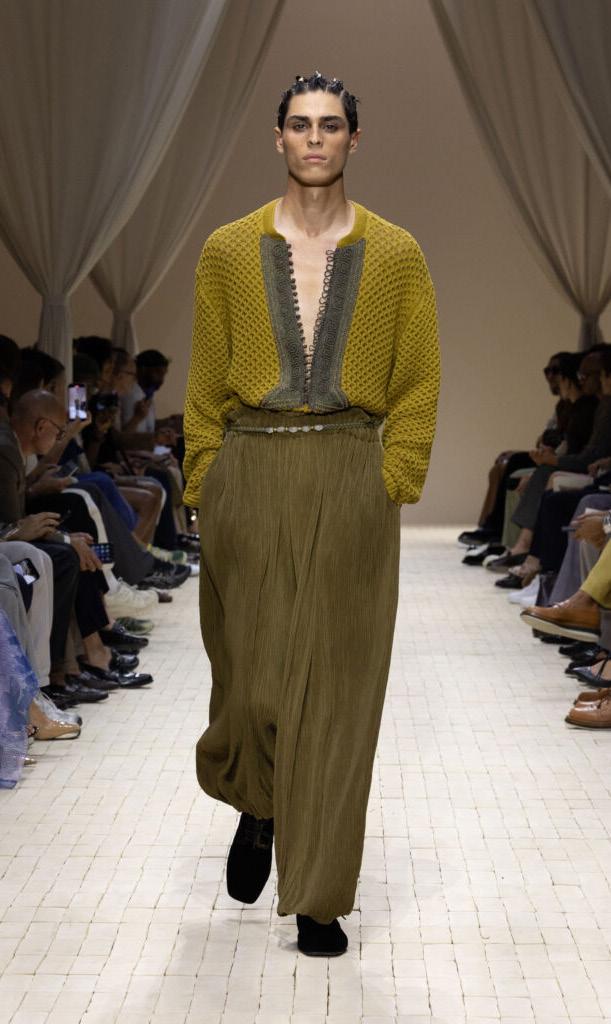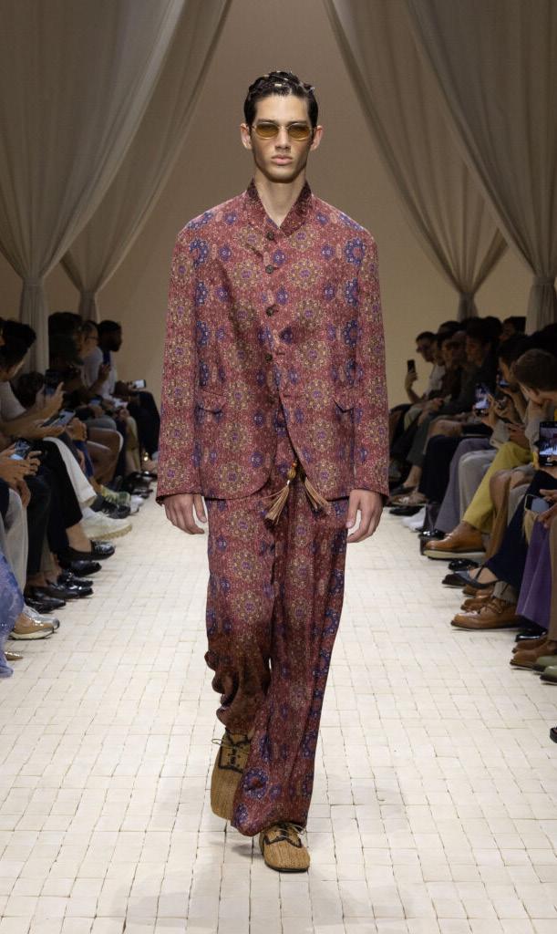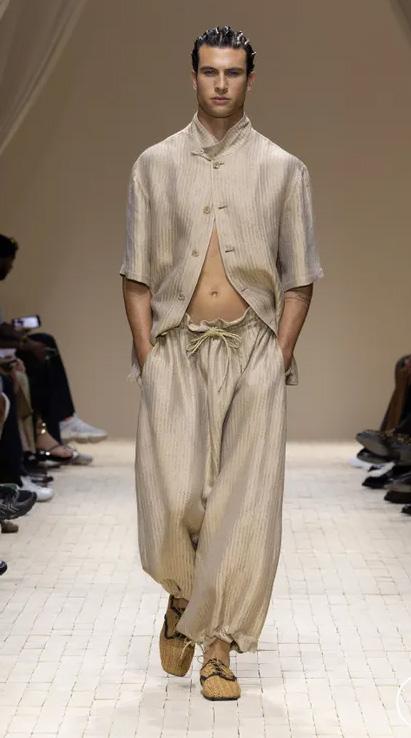 There were feathered tunics, rattan hats with trailing ponytails, smock tops printed with safari sketches and enough plissé to pleat the Sahara. Woven in were nods to Moroccan mosaics, Berber textiles and tattooed smock stitching. Soft tailoring – Armani’s bread and butter – held its ground in textured linens and cold-dyed cottons while beads, charms, silk embroidery and metal amulets swung from necks like portable relics. Adding to the desert-raider feel, the palette told a sun-baked story: scorched earth, saffron sand and desaturated red, all tinged with the melancholy blues of steppe shadows.