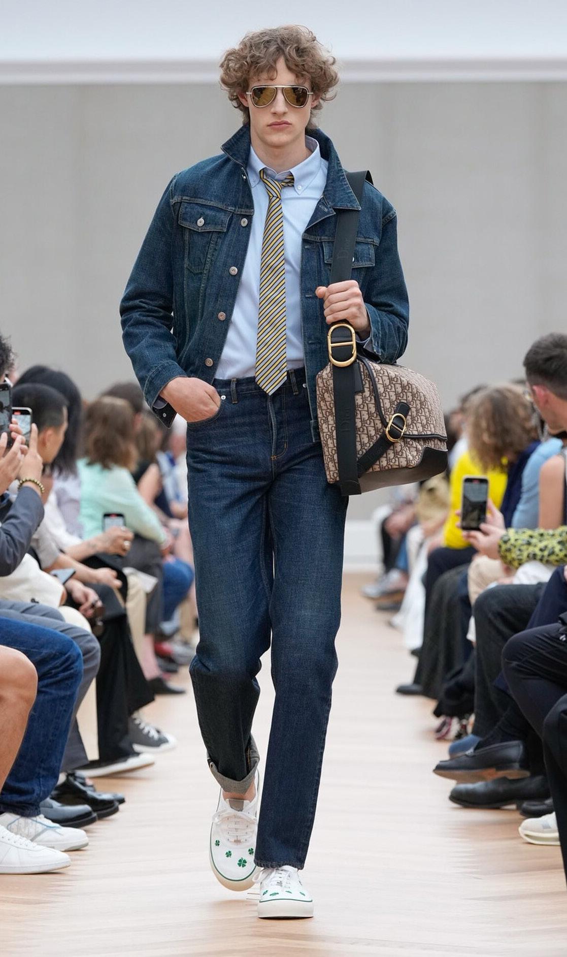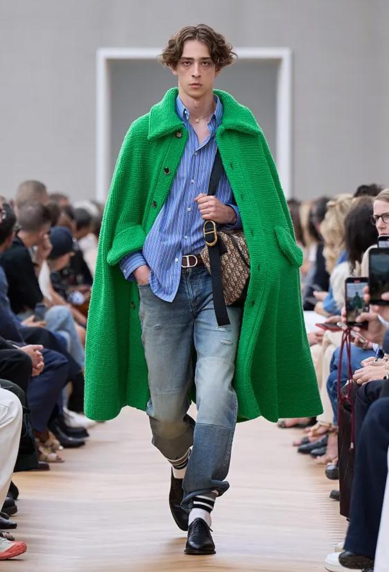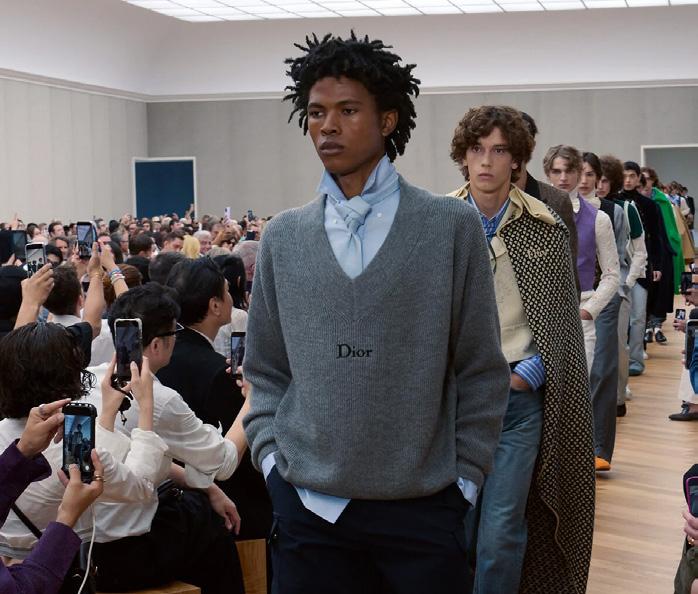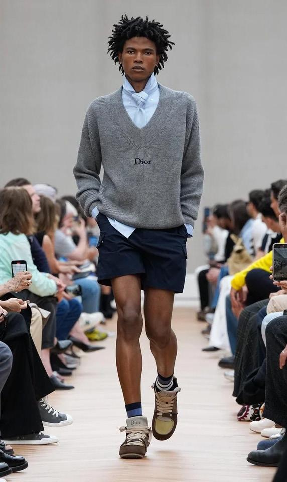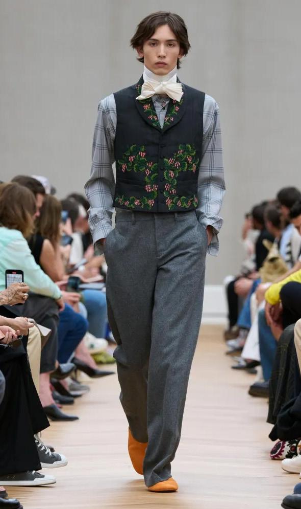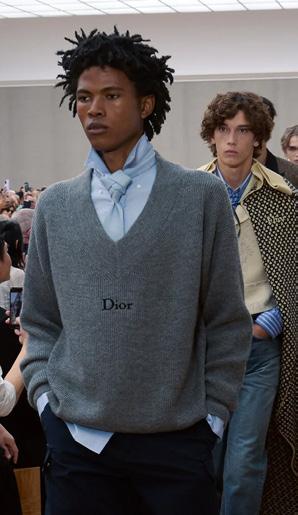 French menswear. “They are incredibly rare, but we found a collection of original waistcoats,” he explained. “For me, and for all my generation, Margiela was God. So I thought, Let’s make them replicas.” It was his route into showing the elevated patrimony of Dior’s haute couture ateliers: the flower embroidery, the latticed gold buttons, the exact color of a mauve moiré silk waistcoat. The closeness of the presentation meant one could gasp at the exquisite French quality of a pink faille waistcoat and practically sense the refinement of a silk evening scarf as it swished by. But Anderson wants to land all of that in reality too: He’d thought about the idea of boys discovering those pieces “in a trunk and just pulling them on.” That worked, paced out as the show was with a long inventory of Frenchpreppy items (including colorful cable-knit sweaters and normal summery jeans).