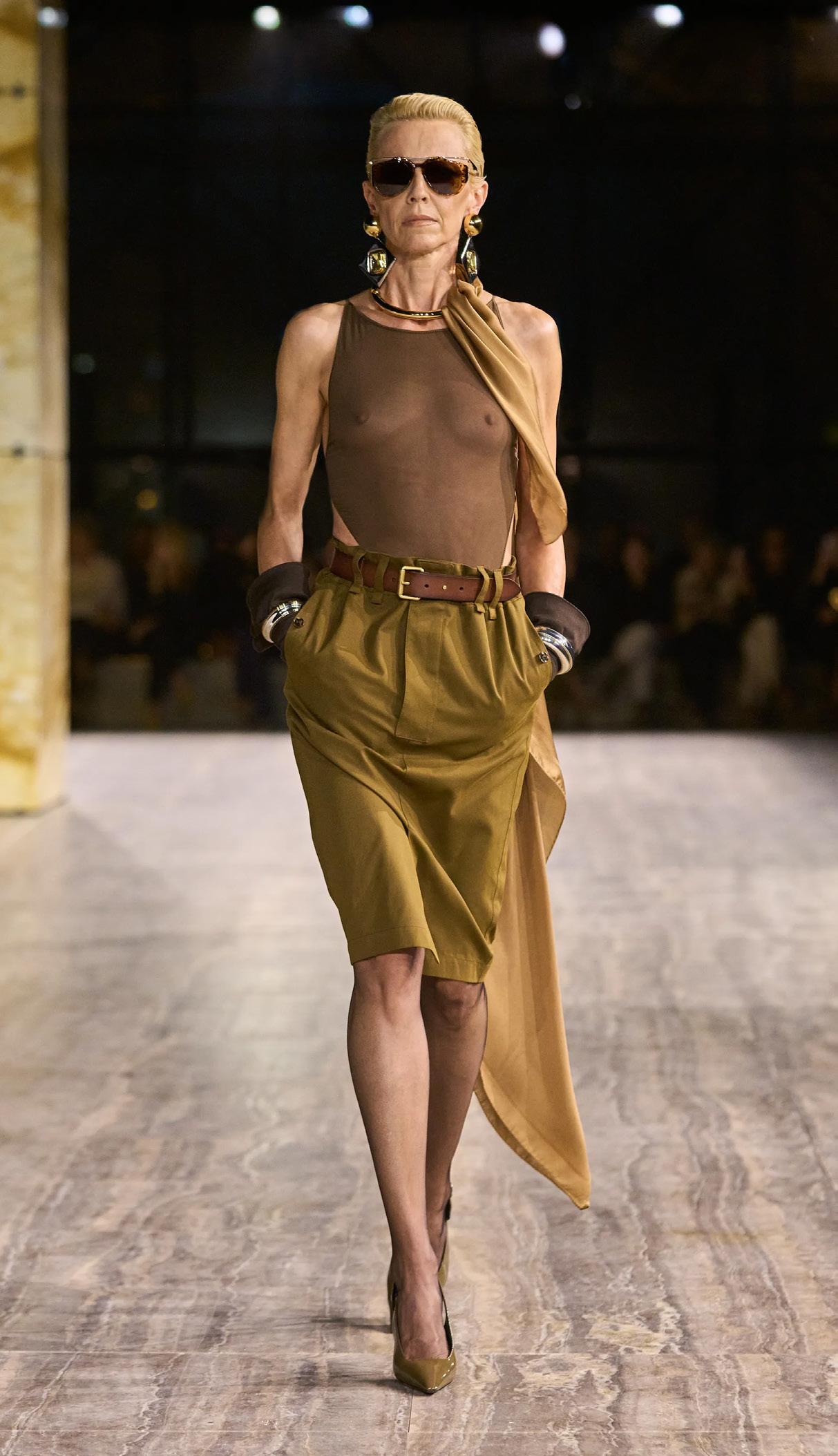 Palette: Out of the 49 looks in this collection, nearly all of them referenced those classic Saint Laurent silhouettes, including the caftan-style dress. Of course, Vaccarello added in a bit of his own signature aesthetic, too—turning the usual beiges and tans to brick reds, saffron yellows, and deep marigold shades.