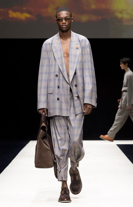 Dapper Emporio Armani men were primed for competition in slouchy suits tied at the waist and matched with bulky riding boots narrowed for the course. Breezy knitwear