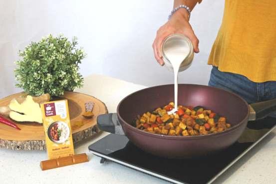 Add any liquid : water, coconut milk or tomato sauce 2 cups for a dish / 4 cups for a soup