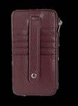 RFID-protected built-in card slots, clear ID slip, full size bill compartment, zipper pocket for coins. Available in textured vegan leather and smooth vegan leather.