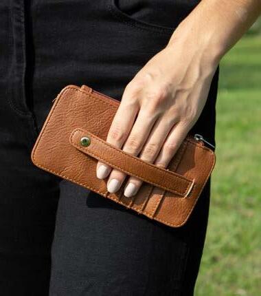 RFID-protected built-in card slots, clear ID slip, full size bill compartment, zipper pocket for coins. Available in textured vegan leather and smooth vegan leather.
