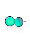 Polished crystals are backed with clear glass. Their luminous colors seem to change when seen from different angles. Colors shift depending on lighting, skin tone, and clothing color.