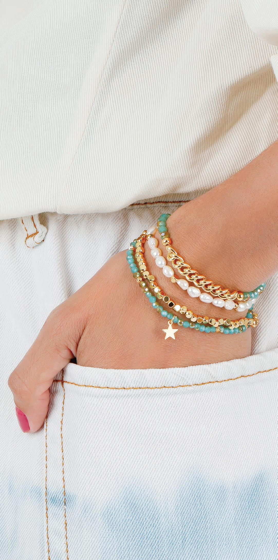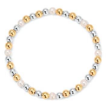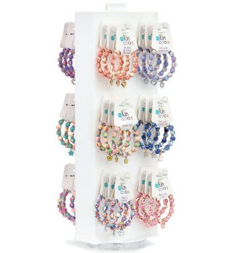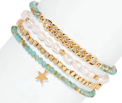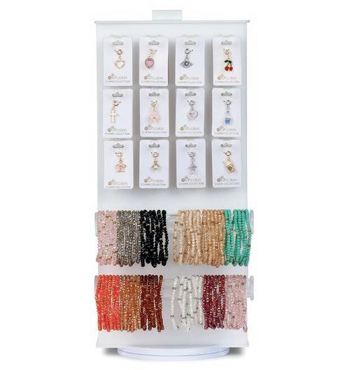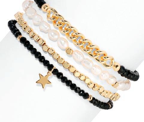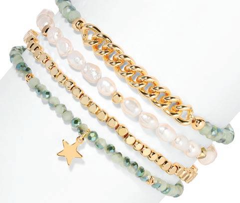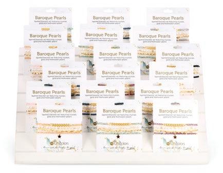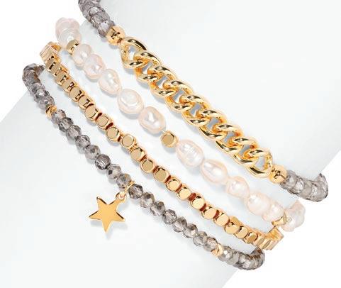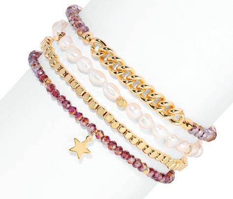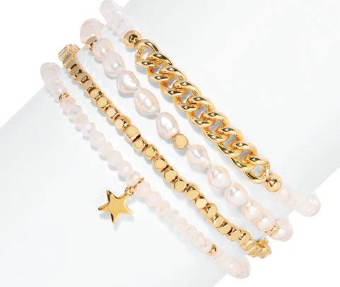 Baroque Pearl Bracelets deliver a highenergy, high-visual sales program built to stop shoppers and drive add-on purchases. This mixed set of four stretch bracelets updates a proven classic with layered designs featuring pearls, crystals, gold-plated accents, and a finishing charm on each piece. Wearable individually for a refined look or stacked together for maximum impact, the set naturally encourages styling play and gifting. It’s an easy win for retailers looking for broad appeal, strong display presence, and fastturn performance across age groups.