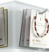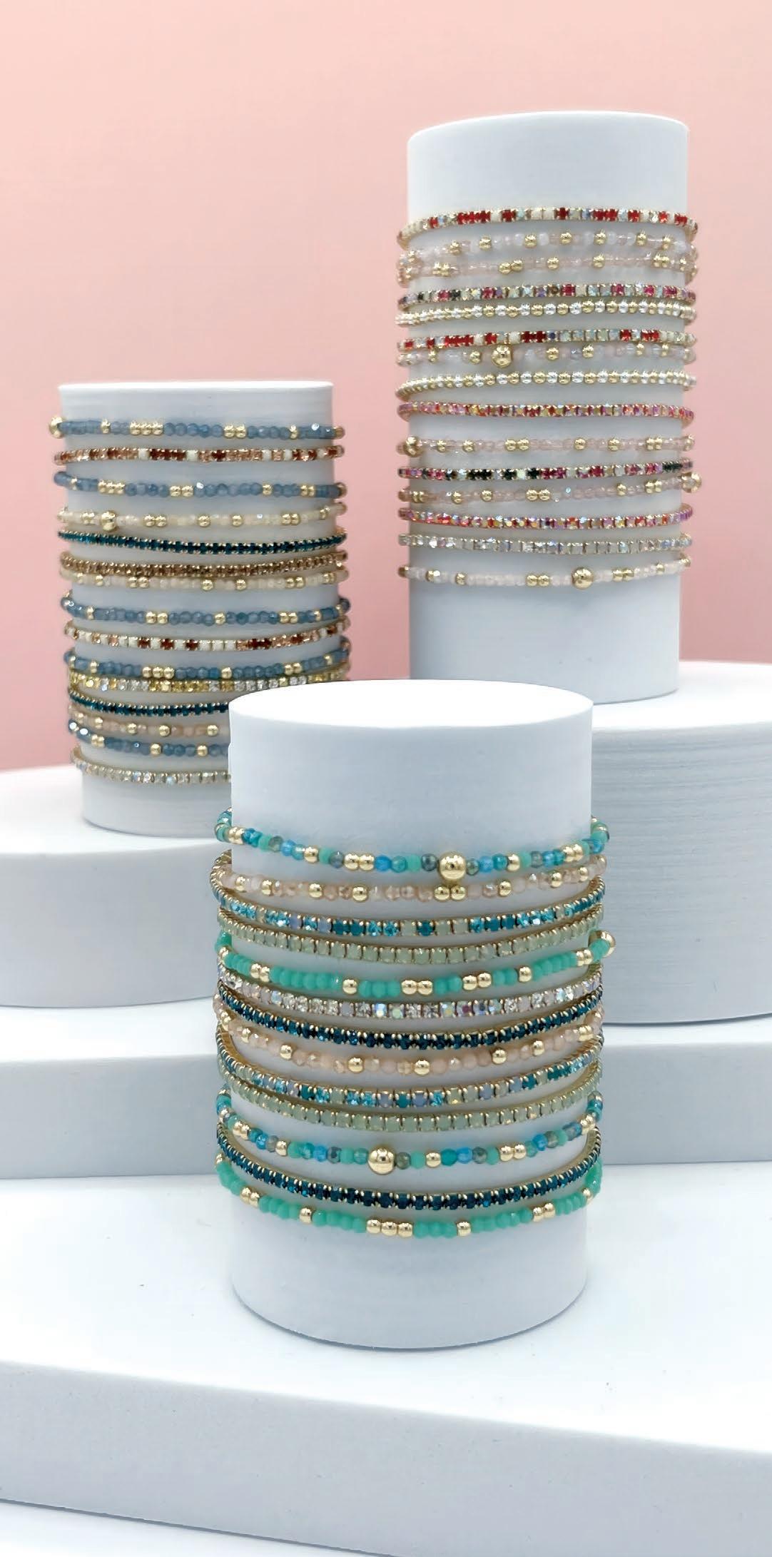 Mini-Crystal bracelets prove that small details can drive big sales. Sparkling 4mm crystals are accented with gold and silver spacers for a refined, easy-to-stack look. Lightweight, colorful, and endlessly layerable, these bracelets appeal to fashion-forward shoppers who love building their own combinations. Designed for impulse appeal and repeat purchase, this program performs beautifully on our counter wood displays.
