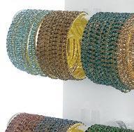 6 each of 24 petite crystal bead styles. 9 each of 24 petite crystal tennis styles, 24 pieces of mini gold or silver bracelets. Includes $65 wood spinner display, offset with 24 FREE bracelets.