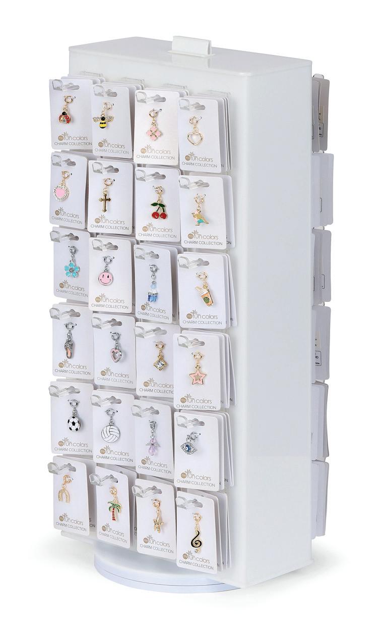 4 each of 24 general charm styles, 2 each of rhinestone gold and rhinestone silver initial charms. Includes $40two-sided display, offset with 12 FREE charms.