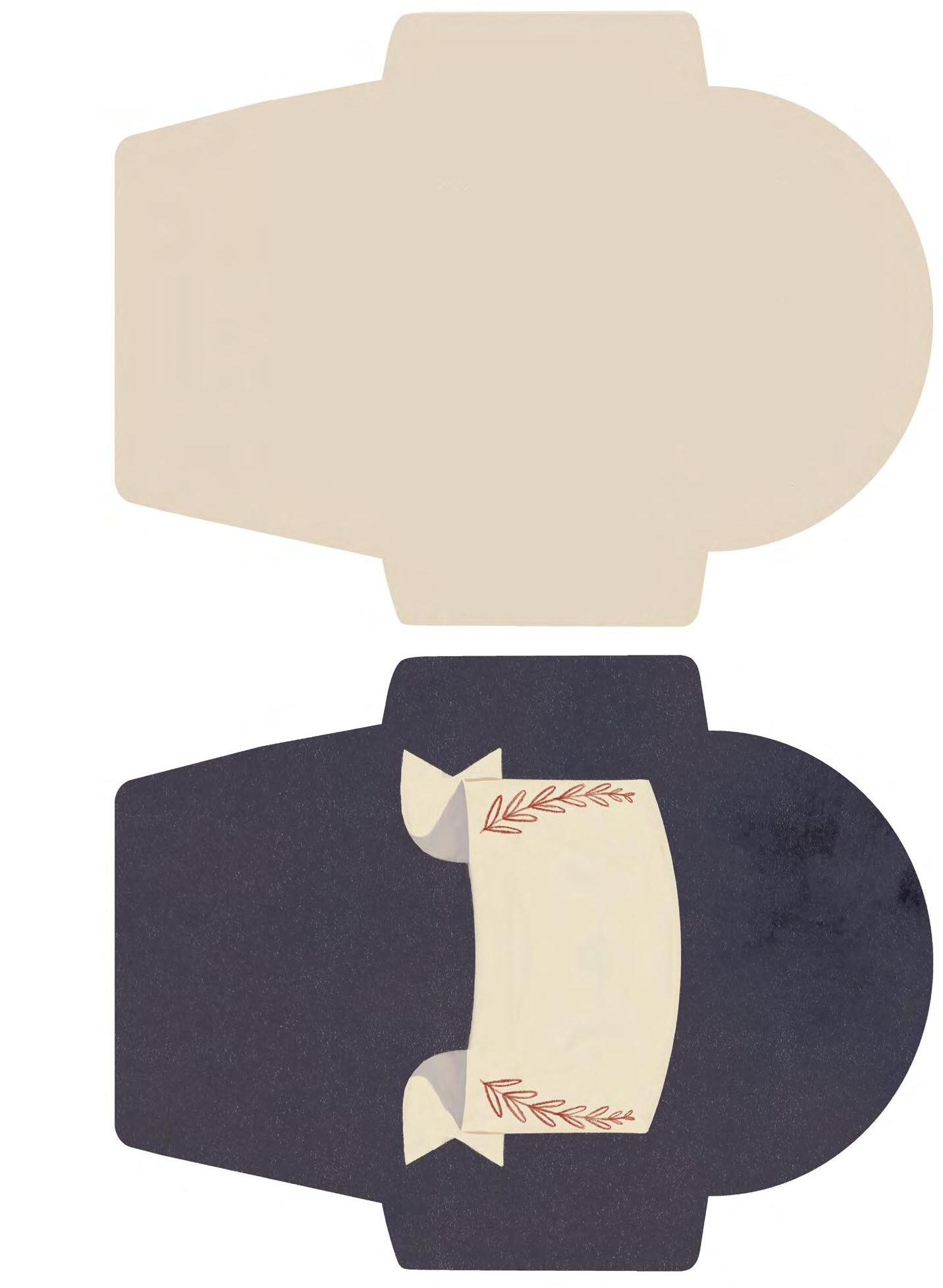 All card sizes vary & fit into a coordinating 5" x 7" kraft paper envelope with white ink and scalloped details. Cards fold flat for mailing and stand open for display.