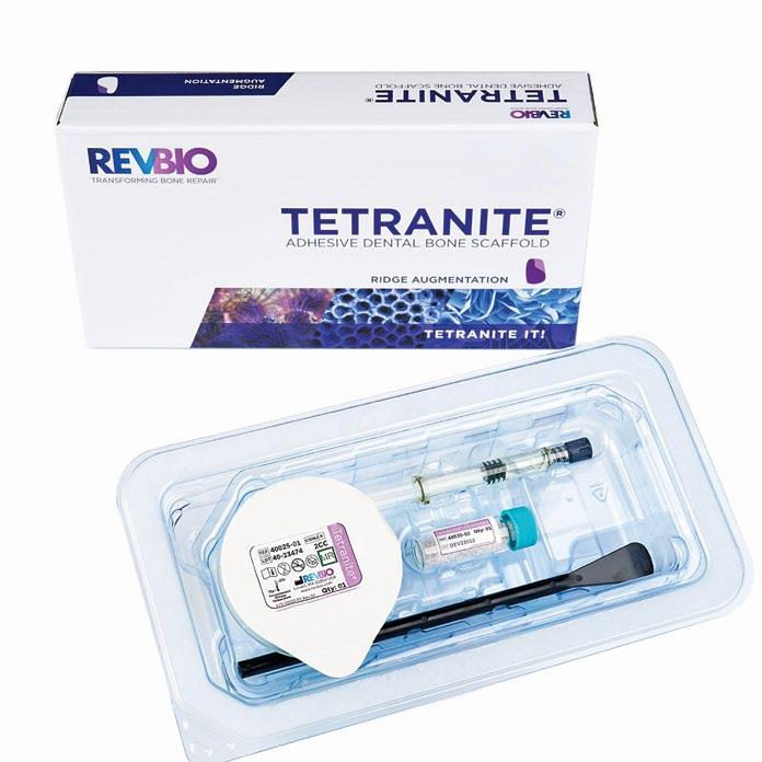 RevBio has developed Tetranite® Adhesive Dental Bone Scaffold (TN-ADBS), a synthetic, porous, cohesive organic-mineral bone scaffold with adhesive properties that resorbs and is replaced by bone on a timescale commensurate with existing graft materials but does not require ancillary fixation or containment devices.