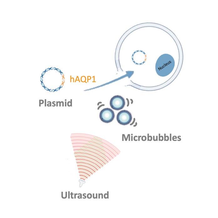 Ultrasound-assisted gene transfer is based on sonoporation generated by ultrasound, enabling gene transfer into cells. The delivery of a water channel to glands in a large animal model restored salivary flow post-radiation to pre-treatment levels, demonstrating efficacy of our non-viral gene transfer approach.