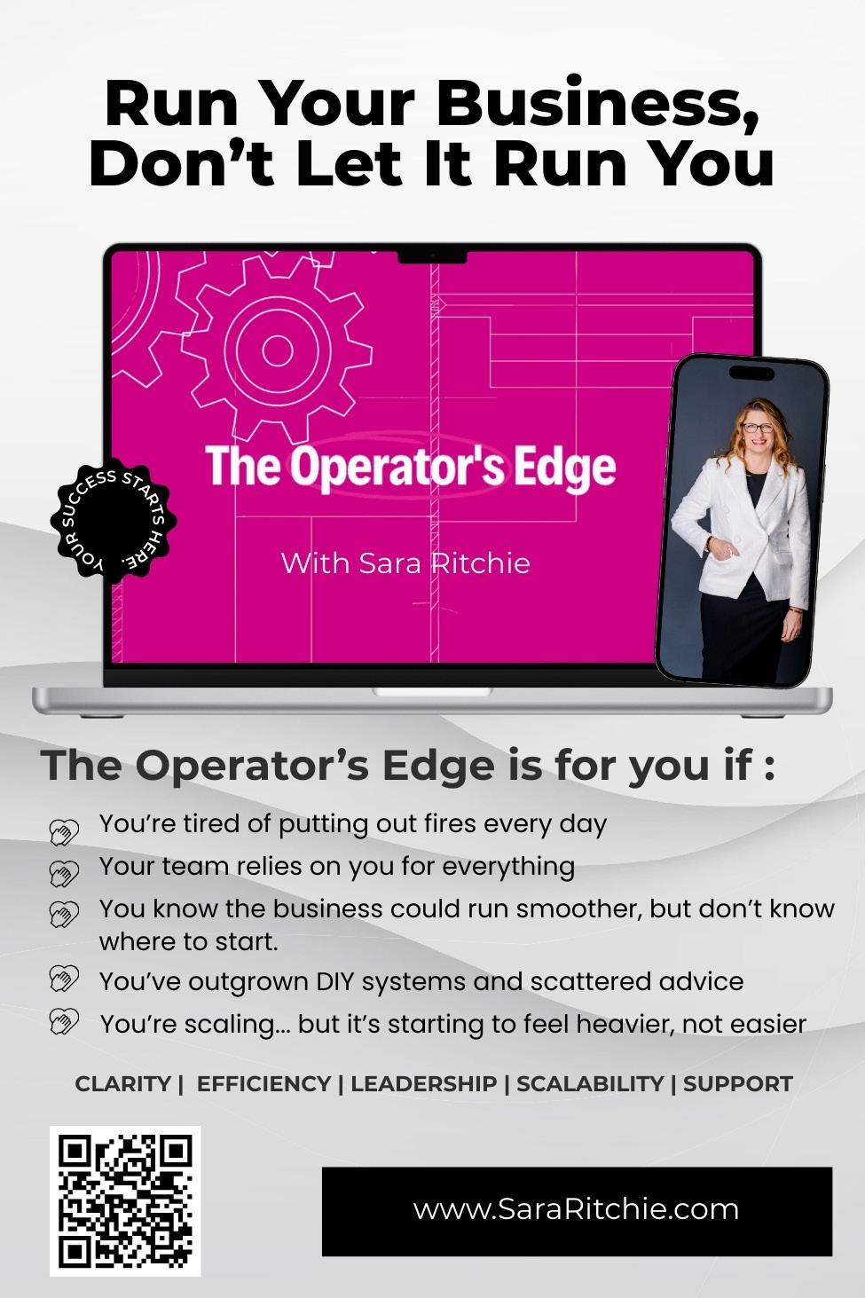 Sara Ritchie is an operations strategist and fractional leader who helps executives turn chaos into clarity. As the founder of The Operator’s Edge, she blends data, intuition, and AI-powered systems to bring calm, structure, and growth to ambitious businesses. Sara empowers leaders to streamline operations, elevate their teams, and lead with presence, purpose, and confidence.