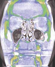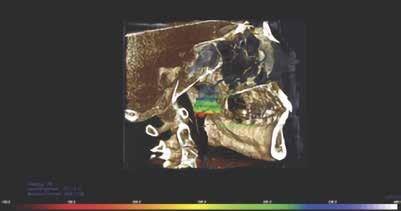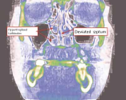 túlterhelés elzárhatja az orrlégutakat, ezért xilit orrspray-t (Xlear) ajánlottunk. A xilit egy olyan cukor, amely antimikrobiális és gyulladáscsökkentő hatású. Szájszárazságban szenvedő, fogszuvasodás és parodontális betegségek szempontjából veszélyeztetett betegeknél alkalmazzák. Az orrjáratokról készült i-CAT-felvételek összehasonlítása azt mutatja, hogy a lágy szövetek hiper trófiája csekély, a septum pedig egyenesebb, amely az orr légáramlásának drámai növekedését eredményezte (14. ábra). Nagyon érdekes ered-