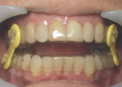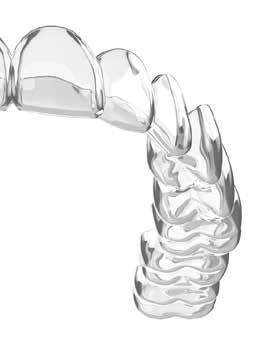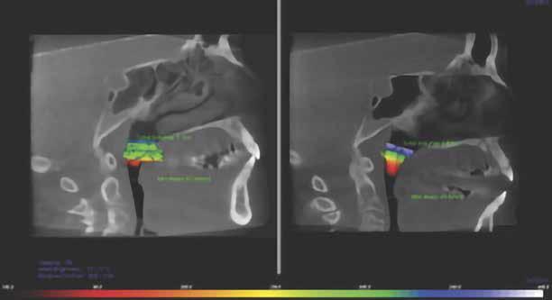 tegek orális készülékterápiával (OAT) történő sikeres kezelésében [17]. Az orrlégúti elzáródás közvetlenül öszszefügg a nappali fáradtsággal [18]. Az i-CAT képalkotó szoftver lehetővé teszi az oropharyngeális légutak volumetrikus értékelését. Ennek a betegnek a kapott adatok alapján súlyosan veszélyeztetett légútja volt, minimum 61,3 mm-rel. A színskála azt mutatja, hogy az értékelés alsó határa 100 mm (9–11. ábra). Kezelési tervünkben OAT (EMA II), fül-orr-gégészeti konzultáció és egy nyomon követő alvásvizsgálat szerepelt. Az FDA által jóváhagyott alvásfogászati készülék 2012. szeptember 5-én került szállításra (12. ábra). A Sibilant Phoneme (Sziszegő fonéma) harapásregisztrációs technikát használtuk a készülék elkészítésének a kiinduló helyzeteként, mivel ez fiziológiai, nem pedig konstrukciós technika. Ez az egyetlen olyan harapásregisztrációs technika, amely bizonyítottan és szakmailag lektorált folyóiratban publikálva jelent meg. Ennek a harapásregisztrációs technikának lényege, hogy megnyitja a légutakat, de amely a legfontosabb, csökkenti azok összeesését [19]. Az OSA-ban szenvedő betegeknél a légzés kizárólag csak alvás közben áll le, ezzel szemben ébrenlét közben soha nem áll le. Így az oropharyngealis légutak térfogata kevésbé fontos, mint azok összeesése. Ez azt jelenti, hogy ritkán van szükség titrálásra, ha a fonetikus harapásregisztrációt kiindulási pontként használjuk. Ez a páciens tökéletes példa erre, mivel az ő készülékét soha nem kellett titrálni. Az orofaringeális térfogatok (13. ábra) az ébrenléti kiindulási állapotban és a harapásregisztrációval csak kis különbséget mutatnak, azonban az