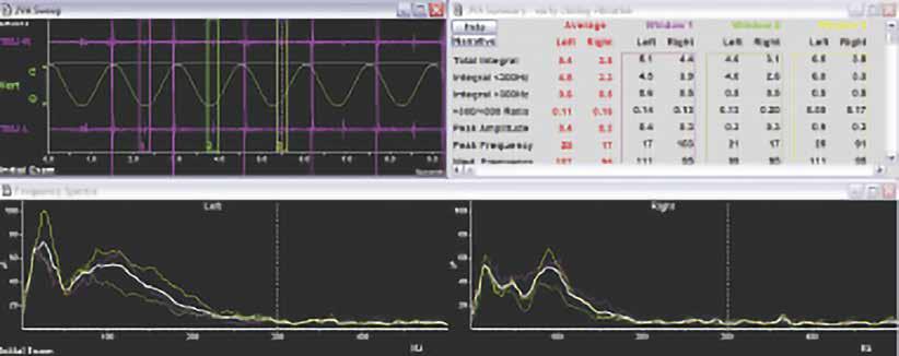 3. ábra: Porckorongmozgás, perforációk nélkül, gyulladással összhangban. A függőleges szaggatott vonal elválasztja a lágy szöveti rezgéseket (0–300 Hz) a kemény szöveti rezgésektől (>300 Hz).