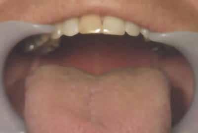 angiotenzin II receptor antagonista) 50 mg naponta egyszer, Nexium (protonpumpa-gátló, amely csökkenti a gyomorban termelődő sav mennyiségét) (GERD) 40 mg naponta, Intuniv (multivitamin) 4 mg naponta, és aszpirin 81 mg naponta egyszer. Klinikailag a nyelv az okkluzális sík fölött helyezkedett el, hiperkeratózis (B), a nyelv légutakba való behúzódása és Mallampati 4, amely mind minimális szájüregi térfogatra utalt (1–2. ábra). Ezek indikálták az alvásfogászati készülékes kezelést. Az izomtapintás elhanyagolható volt, és az állkapocs mozgástartománya is normális volt. A maximális nyitás 45 mm volt (1–2. ábra), oldalirányú elmozdulással 12, illetve 10 mm balra és jobbra. Az állkapocs normál mozgástartománya 42–52 mm volt maximális nyitás esetén, emellett oldalirányú elmozdulás 14 mm volt [13]. Az állkapocs ízületeinek dinamikus funkcióértékelését Joint Vibration Analysis (JVA [BioResearch]) segítségével végezték, és a lágy szövetek esetében a normál határokon belülinek, valamint kétoldali porckorongok perforációjának mentesnek találták (3. ábra)
